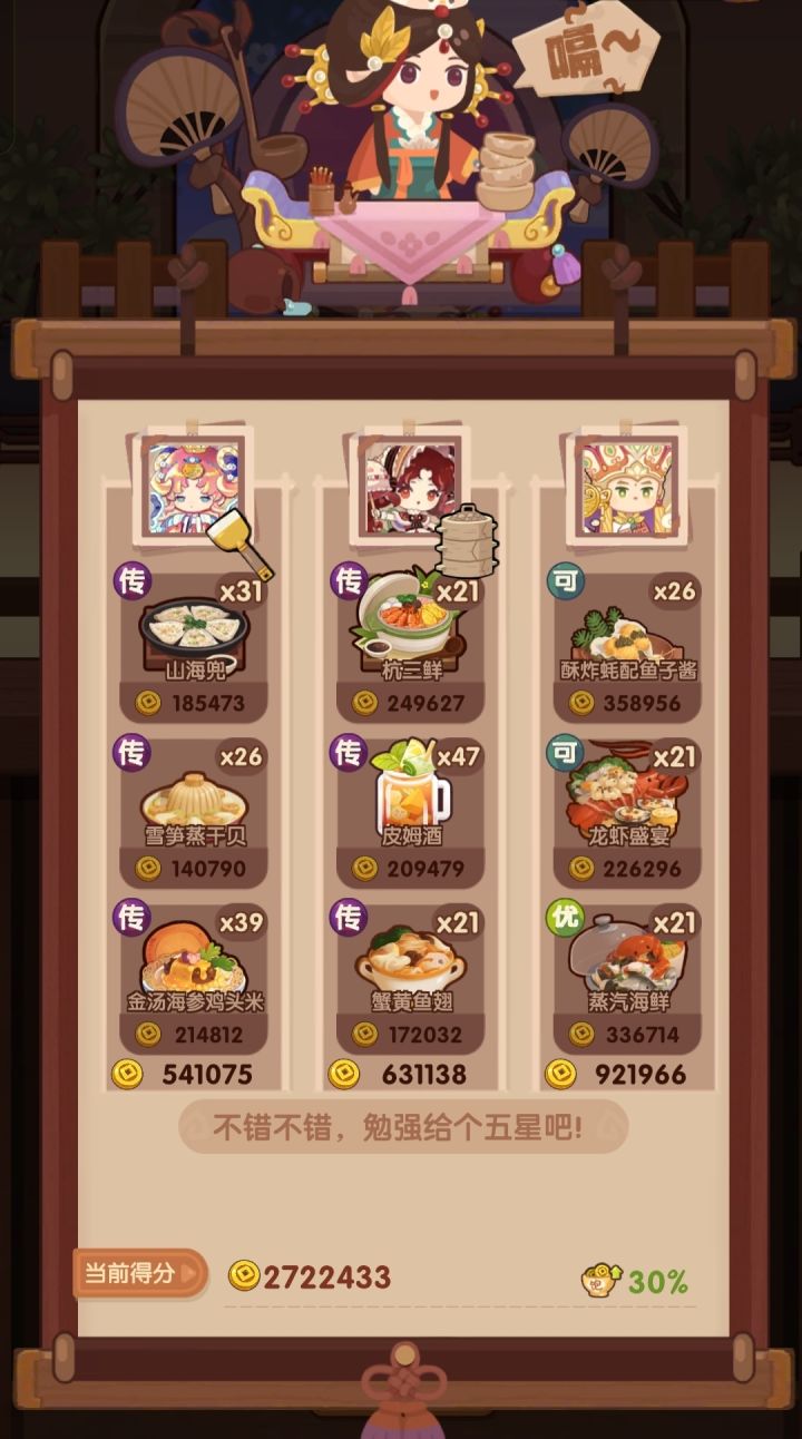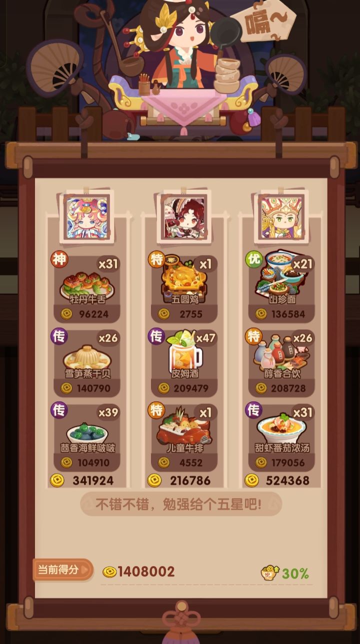 悲,不是炒果。首先看桌子,粗算日均231玉璧,和三国桌并列第一,可喜可贺。并且三国是上下限方差极大的赌桌,马年桌相比起来更稳定些。然后看厨具,技法增加+调料基础售价增加。按调料分类的售价通常会比按技法分类的售价适配范围更窄,应用价值更低。除非能精准地卡到某个厨子最适配的一到两道菜,否则这类厨具就会食之无味,弃之可惜。最后看菜。刚开始看到这个五分半的时长时我是不太满意的,和去年几个三分半/四分
