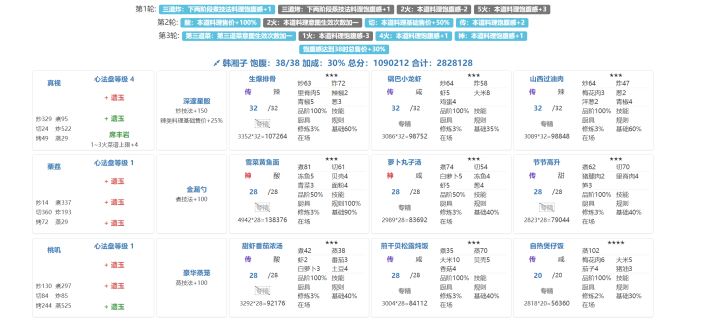 323.1w(省5线317w,艰难飘过)。思路分享,抛砖引玉!公认风云宴里最难一期。最优解是避开韩湘子,集中菜厨争取钟离权单满,这对菜厨深度和基修的要求比较高。如果绕不开韩湘子,那就会面临配置卡手的问题:1. 第三轮压饱腹的限制基本拆散了目前的体系作战阵容 2. 饱腹上限低+加分意图少,很难得高分。钟离权:1. 根据意图【烤切】体系比较适用。目前存在两种配置思路:a. 第一轮上3道【烤切】菜