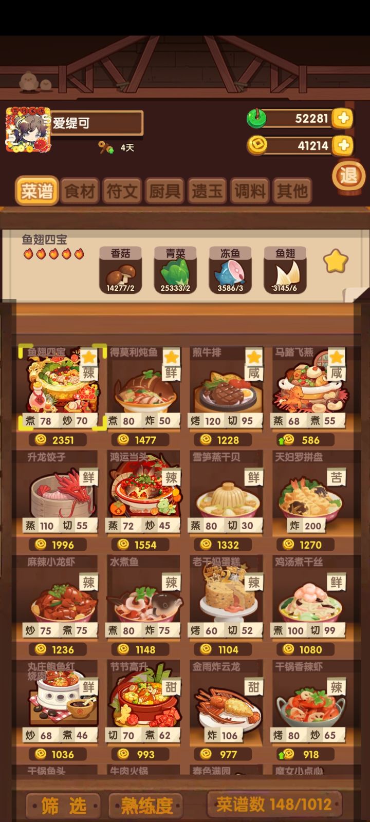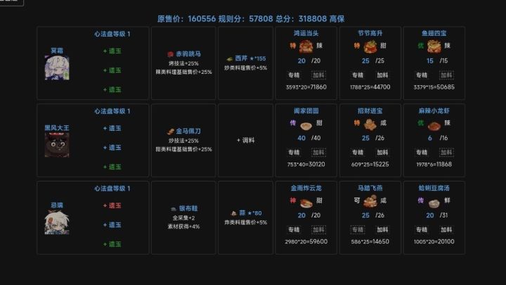 入坑53天的萌新也是吃上御前高保了(泪本来看到这次大赛的规则人都懵了,寻思着就我这点菜谱量,可能低保都混不上(。然而,计算器还是太好用了.jpg除此之外最大的感想就是一定要听劝,但凡开了调料系统之后没有当机立断去采集,这次都上不了高保。原本还挺心疼采一次6w金币,而且只能拿最低级的调料,但事实证明该花的钱还是得花,在1200玉面前这二十多万金币算个球(作业如图,全员无修炼,菜谱和厨具基本