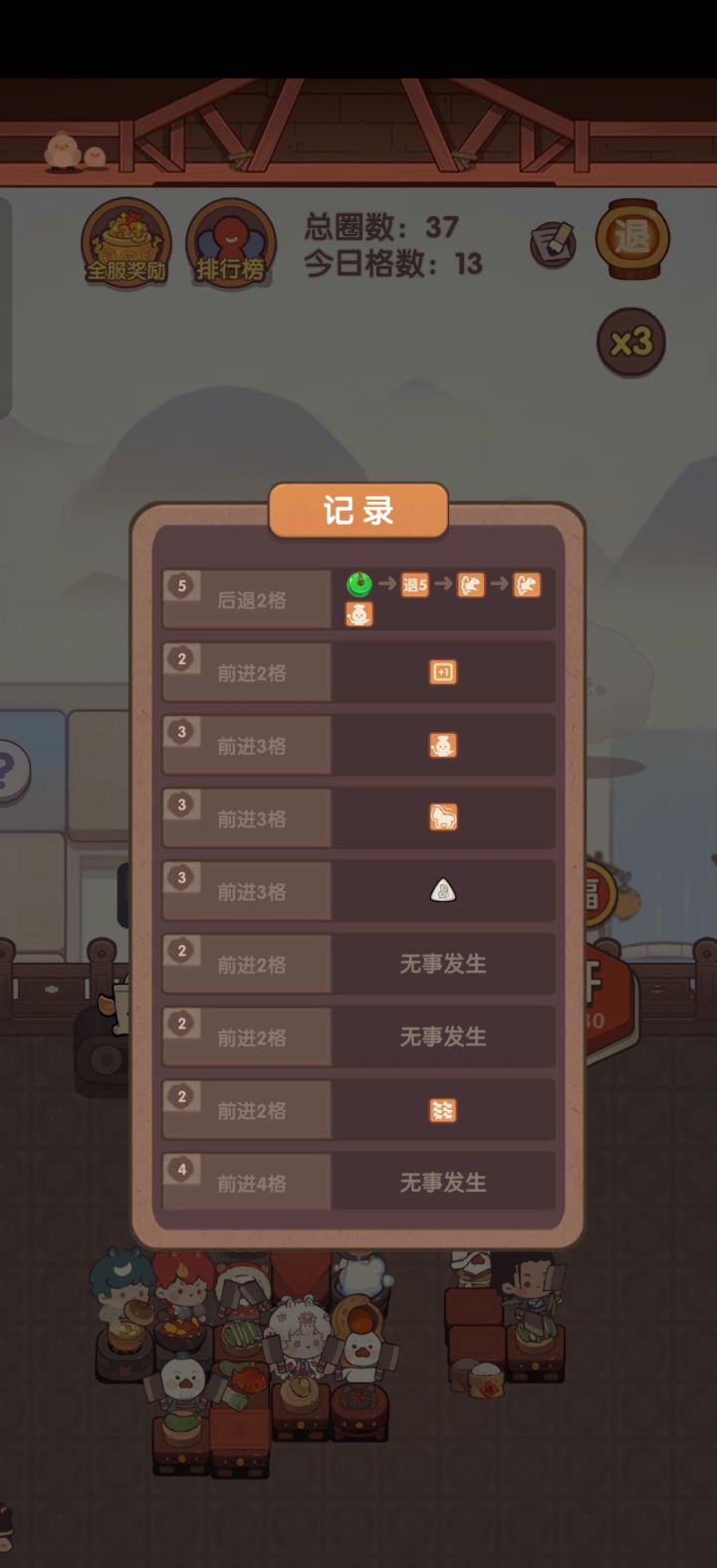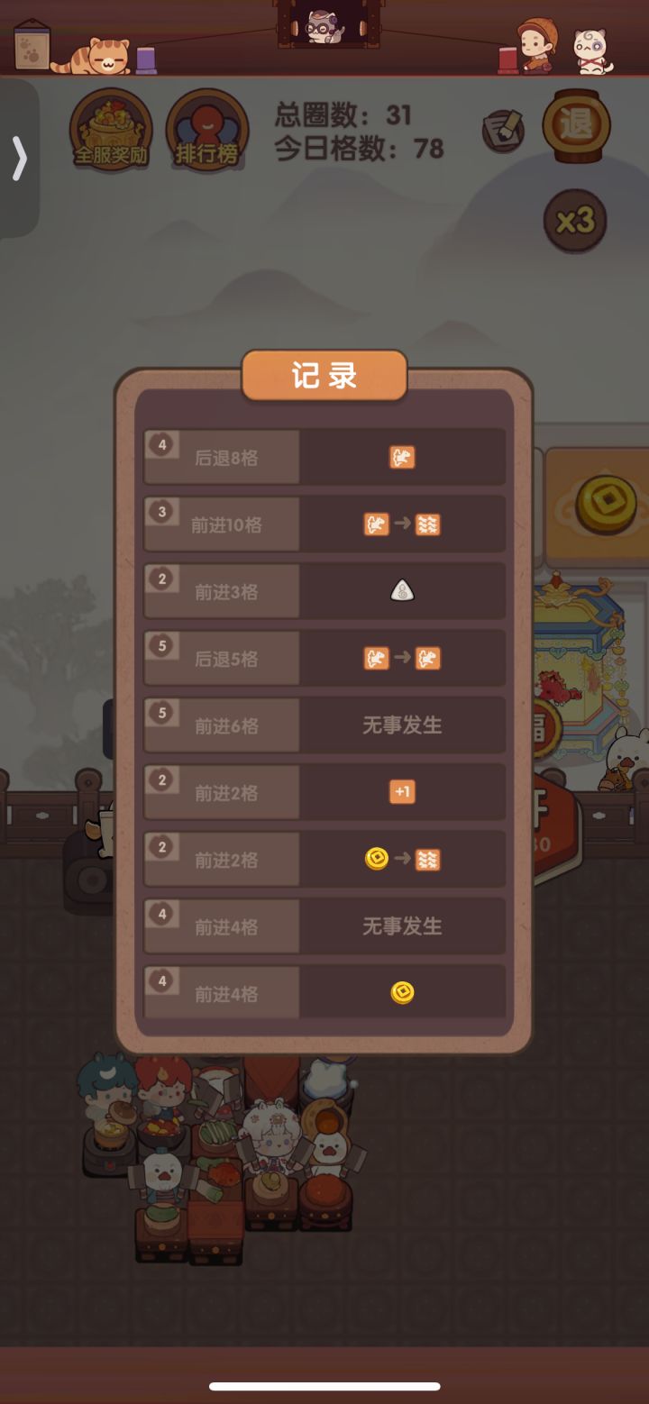 变大5回合,结果第三回合遇到个后退的,直接把变大buff吃掉了。昨天还遇到后退到普通格子,莫名其妙给金币的,关键他让后退的步数还跟实际的对不上