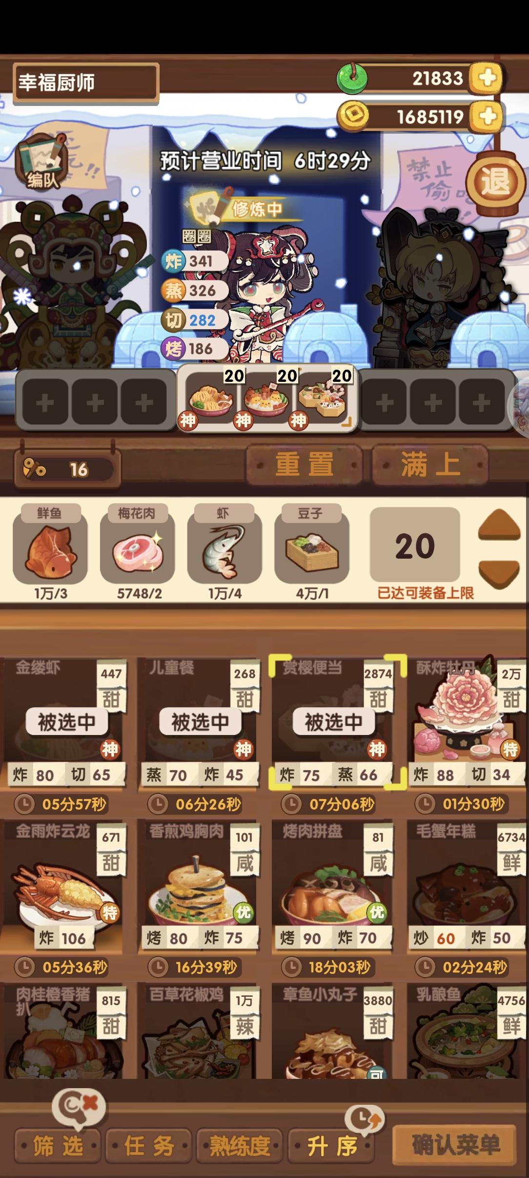 329w省满(省5线,293w,离单满依旧很遥远)。解题思路分享,抛砖引玉,能对其他小伙伴有启发最好!这期整体不难,两位贵客的加分意图均很多,且对【烤】系需求明显,又是一个丐版【烤切】体系能够发挥的宴会场景。唯一需要注意的是,针对菜厨浅的小伙伴,由于菜厨不能复用,需要斟酌把【烤切】体系放在哪位贵客上。蓝采和:1. 第一轮主要是根据第二轮高价菜厨情况决定拿哪两个售价buff:【蒸