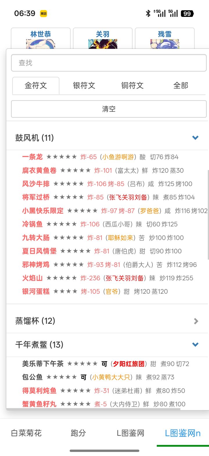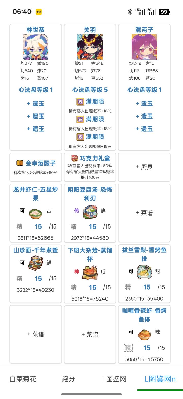 323.1w(省5线317w,艰难飘过)。思路分享,抛砖引玉!公认风云宴里最难一期。最优解是避开韩湘子,集中菜厨争取钟离权单满,这对菜厨深度和基修的要求比较高。如果绕不开韩湘子,那就会面临配置卡手的问题:1. 第三轮压饱腹的限制基本拆散了目前的体系作战阵容 2. 饱腹上限低+加分意图少,很难得高分。钟离权:1. 根据意图【烤切】体系比较适用。目前存在两种配置思路:a. 第一轮上3道【烤切】菜