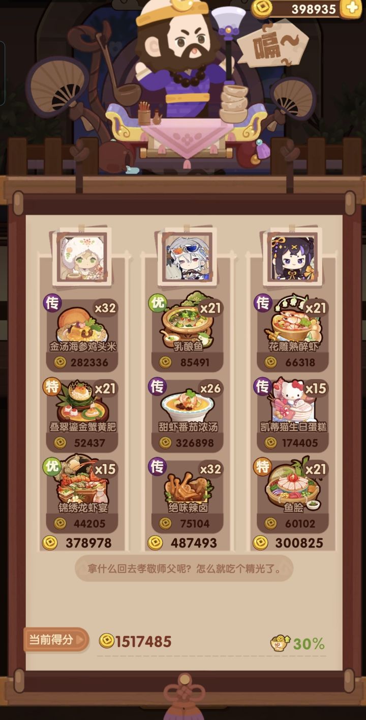 342.2w省满(省5线325.2w),缤果池菜厨表现亮眼!宴会思路记录,同时抛砖引玉能对相似进度小伙伴有启发最好!一个月前(20251212)有过一期【卷帘+御弟】,没想到这么快又重新轮到。当时只能州满,想省满代价很大,需要拉满所有上场厨子的心法盘并上满【席丰】。但此次作业加入缤果池的菜厨后,可以低成本轻松打满省满啦!宴会对技法的需求排序为【切】>【煮】>【烤】>【蒸】>【炒】>【炸】,对调