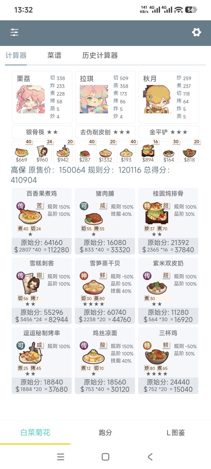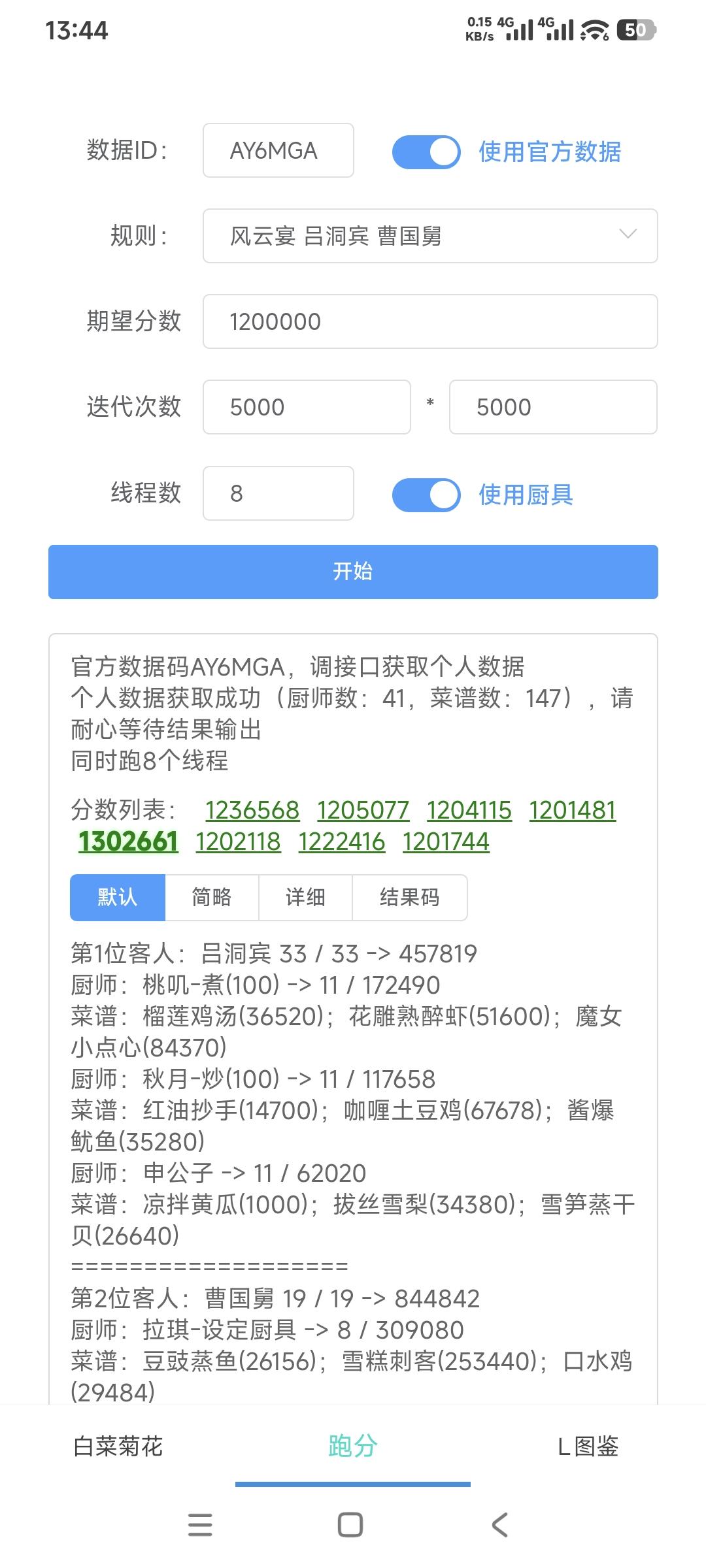 因为想着唠嗑思路 所以图片很多 前两张是一个最终结果。第三张是今天用白菜菊花算的 先上一个菜谱再上厨师 后面再添菜谱,如果没有什么变化就是这样一个分数。后面查了一下距离高保也就差1w分数从图片来看,今早我发的帖子里面关于实验室菜谱研发还是挺有用的 例如这次厨神用到的雪糕刺客、猪肉脯从第四张、第五张图来看,这次厨神萝卜丸子汤也是挺靠前的 至少比猪肉脯高出不少,尽管规则上的分数是扣分。想着能不