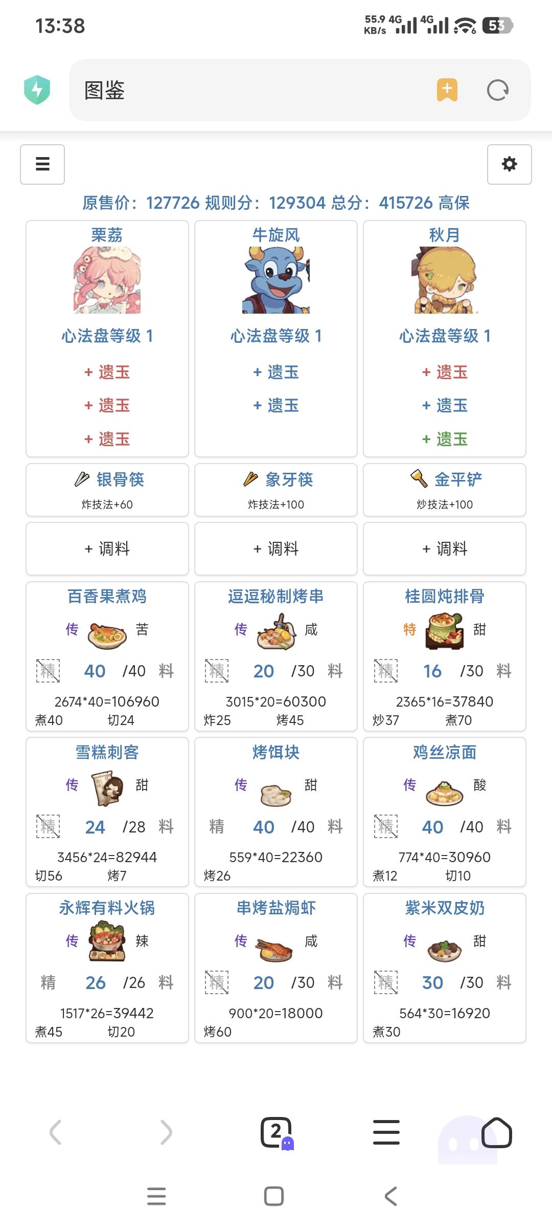 🧱前排提醒 ——满档分数线2980000 本期提供高分单通方案P1-2,省关键食材方案P3-4,吕洞宾这里需要高基修,曹国舅更适合单通。🌼厨具推荐【孔布明】推荐加【炒】技法厨具做【传】海参鸡米头,【瑟雷萨】推荐煮炸技法厨具做传【酥炸蚝配鱼子酱】,【唐三三】推荐蒸技法厨具做特【蒸汽海鲜】,【普洛妮】推荐煮技法厨具做传年夜饭,同时注意前两道不能【传】。🌵P1-2菜谱优化 宝山飞龙锅 下位🔥糟