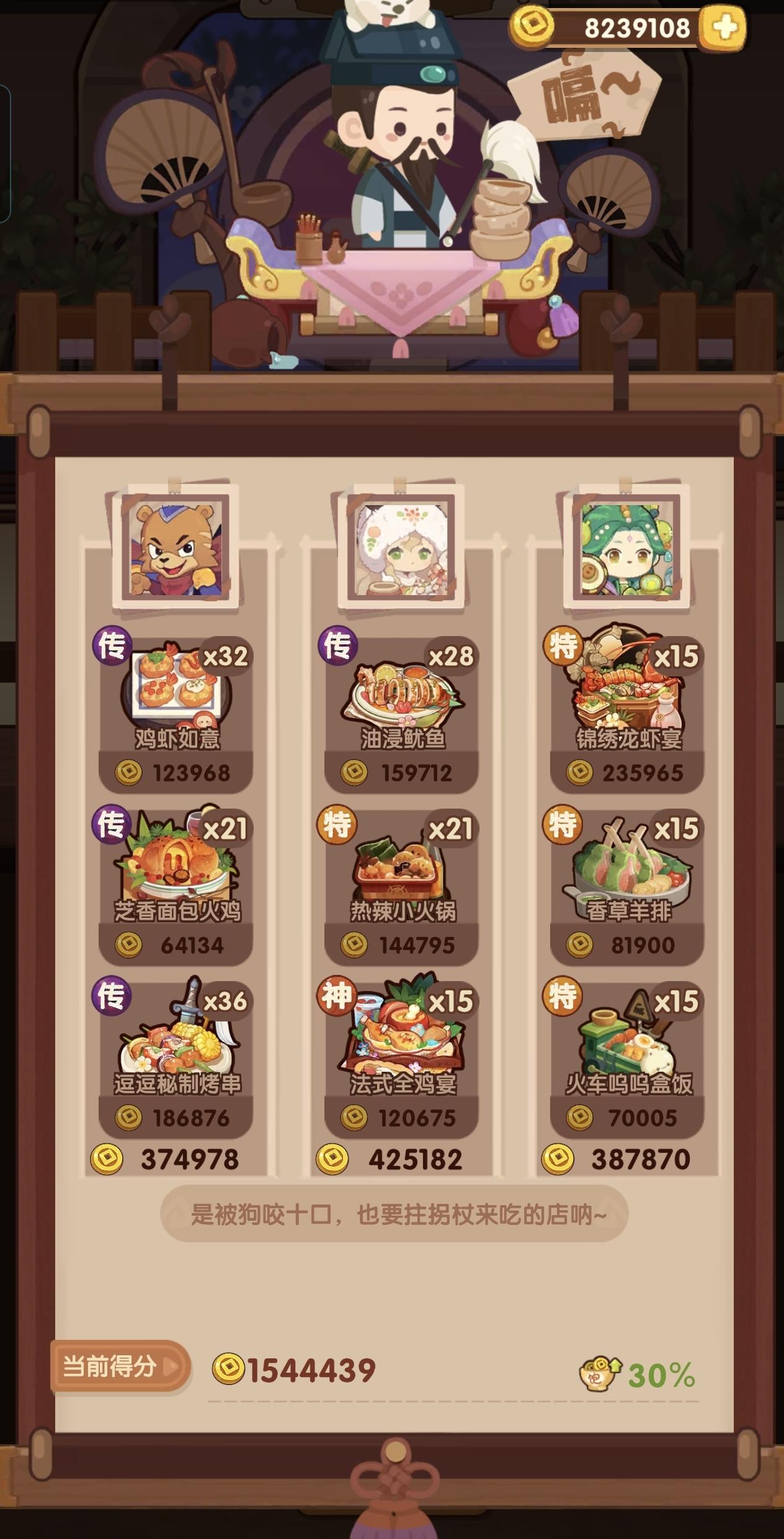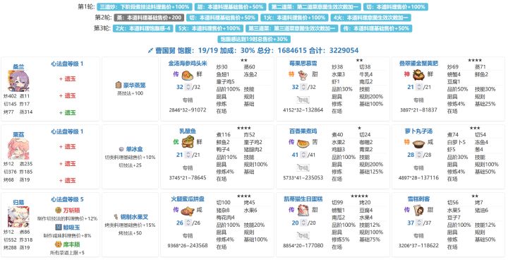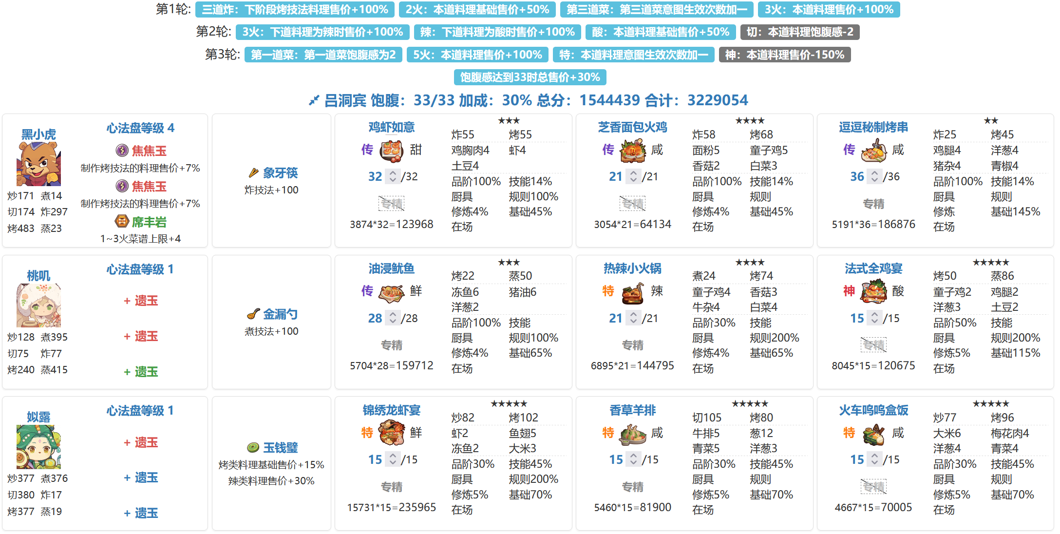 322.9w省满(省5线298w)。解题思路分享,抛砖引玉,能对其他小伙伴有启发最好!虽然这期加分意图很多,但是两位贵客都需要控饱食度,其中吕洞宾还需要额外在第二轮控制菜谱摆放顺序、第三轮控菜谱品级,因此整体配置起来比较卡手,感觉这期整体偏难。 吕洞宾1. 饱腹上限33属于较高范畴,且由于没有加饱食图的意图,却有降饱食度的意图,导致对高火菜的需求偏高。2. 第一轮上三道【炸】