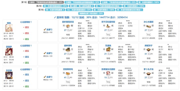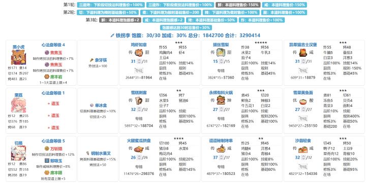 329w省满(省5线,293w,离单满依旧很遥远)。解题思路分享,抛砖引玉,能对其他小伙伴有启发最好!这期整体不难,两位贵客的加分意图均很多,且对【烤】系需求明显,又是一个丐版【烤切】体系能够发挥的宴会场景。唯一需要注意的是,针对菜厨浅的小伙伴,由于菜厨不能复用,需要斟酌把【烤切】体系放在哪位贵客上。蓝采和:1. 第一轮主要是根据第二轮高价菜厨情况决定拿哪两个售价buff:【蒸