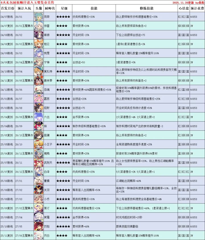 悲,不是炒果。首先看桌子,粗算日均231玉璧,和三国桌并列第一,可喜可贺。并且三国是上下限方差极大的赌桌,马年桌相比起来更稳定些。然后看厨具,技法增加+调料基础售价增加。按调料分类的售价通常会比按技法分类的售价适配范围更窄,应用价值更低。除非能精准地卡到某个厨子最适配的一到两道菜,否则这类厨具就会食之无味,弃之可惜。最后看菜。刚开始看到这个五分半的时长时我是不太满意的,和去年几个三分半/四分