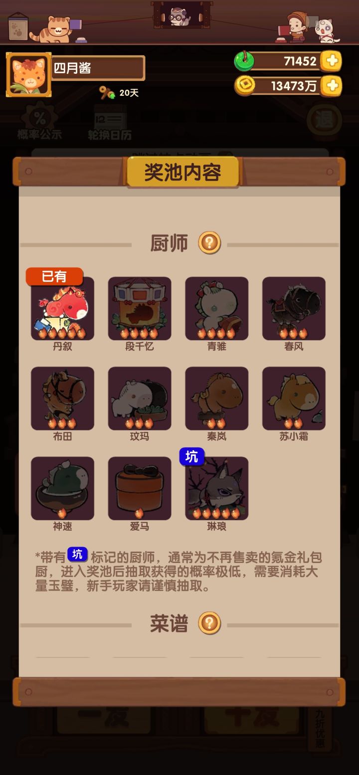 悲,不是炒果。首先看桌子,粗算日均231玉璧,和三国桌并列第一,可喜可贺。并且三国是上下限方差极大的赌桌,马年桌相比起来更稳定些。然后看厨具,技法增加+调料基础售价增加。按调料分类的售价通常会比按技法分类的售价适配范围更窄,应用价值更低。除非能精准地卡到某个厨子最适配的一到两道菜,否则这类厨具就会食之无味,弃之可惜。最后看菜。刚开始看到这个五分半的时长时我是不太满意的,和去年几个三分半/四分