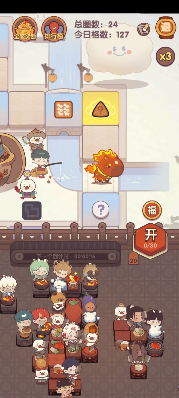 说是五分钟刷新这也没刷新啊,目前感觉上今年过年的奖励要比之前年兽奖励少挺多的目前看下来骰子恢复时间基础是40分钟,最高存储30个,也就是最多20小时你就得上一次线,不然就浪费了。转盘里走到增加厨子的格子可以多一个厨子,厨子+5%时间,至少20个厨子才能20分钟恢复一个骰子。这时候就得玩家10小时上一次线了。怎么说呢,这活动一点都不像过年的活动。20260212,越想越气,什么破活动,纯看脸