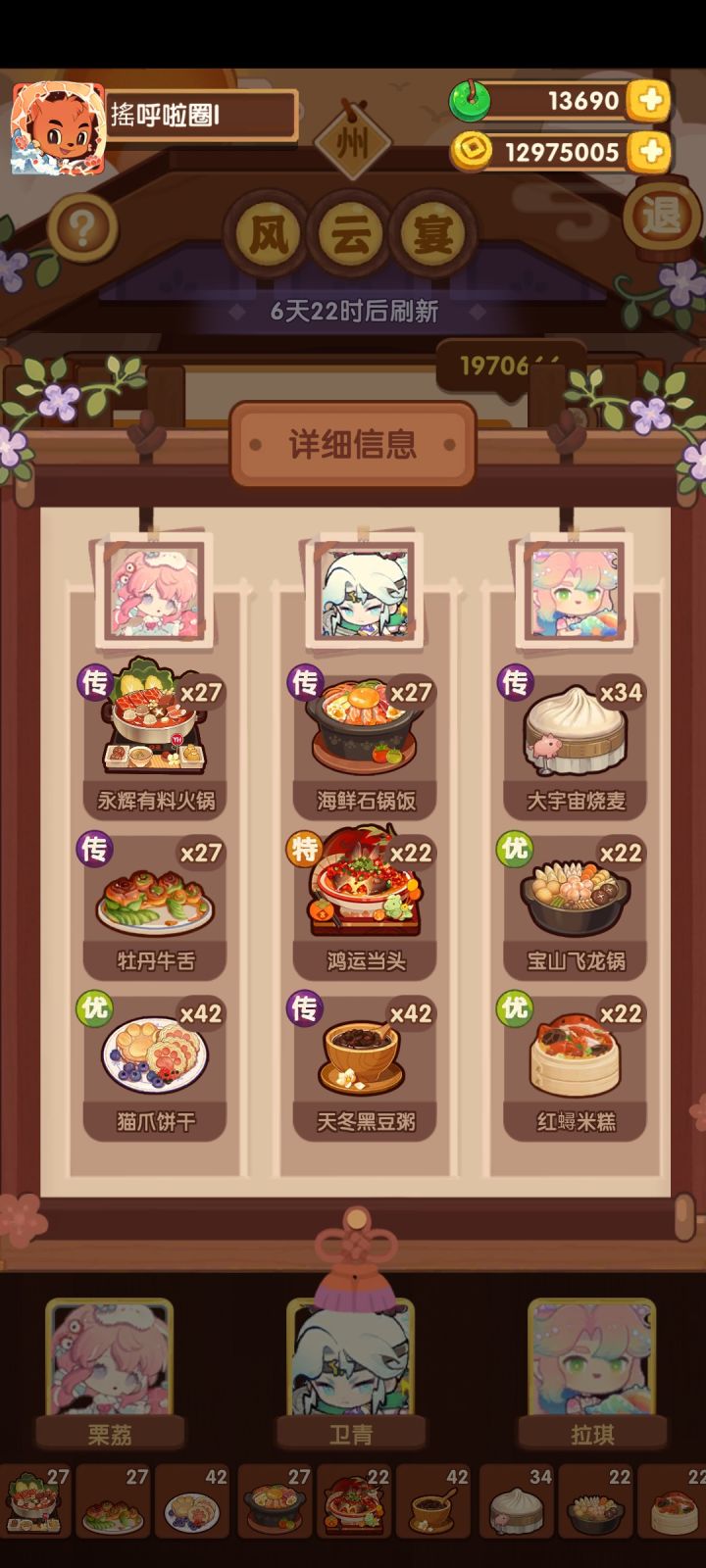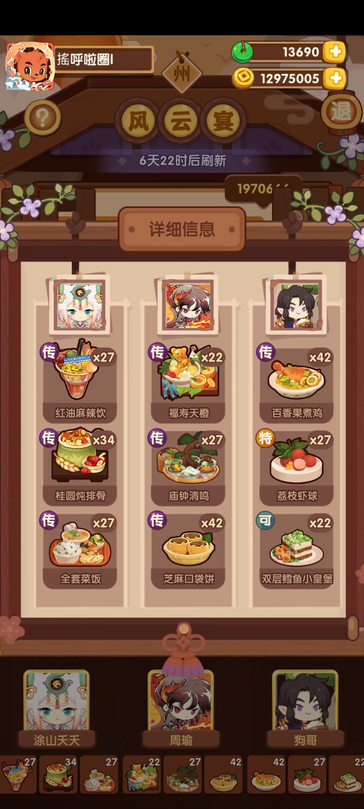 323.1w(省5线317w,艰难飘过)。思路分享,抛砖引玉!公认风云宴里最难一期。最优解是避开韩湘子,集中菜厨争取钟离权单满,这对菜厨深度和基修的要求比较高。如果绕不开韩湘子,那就会面临配置卡手的问题:1. 第三轮压饱腹的限制基本拆散了目前的体系作战阵容 2. 饱腹上限低+加分意图少,很难得高分。钟离权:1. 根据意图【烤切】体系比较适用。目前存在两种配置思路:a. 第一轮上3道【烤切】菜
