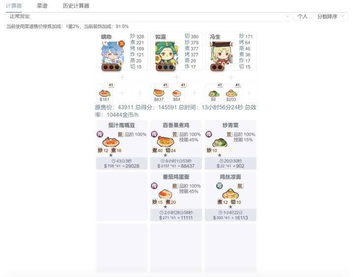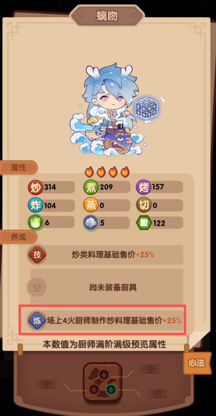 图1为【螭吻】修炼技能介绍,没理解错的话,应该只有【4火】厨才能吃到25%【炒】基售加成?图2是图鉴网在【正常营业】的算分结果,非【炒】系菜,所有厨师都没有基售加成。【螭吻】做【炒】菜有50%基售。但是,高于【4火】的厨师【姒露】以及低于【4火】的厨师【冯生】也能有25%【炒】基售(红框所示)?图3是相同菜厨在白菜菊花的算分结果,算分和图2一致,表明白菜菊花也是非【4火】厨能吃