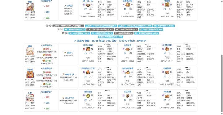 323.1w(省5线317w,艰难飘过)。思路分享,抛砖引玉!公认风云宴里最难一期。最优解是避开韩湘子,集中菜厨争取钟离权单满,这对菜厨深度和基修的要求比较高。如果绕不开韩湘子,那就会面临配置卡手的问题:1. 第三轮压饱腹的限制基本拆散了目前的体系作战阵容 2. 饱腹上限低+加分意图少,很难得高分。钟离权:1. 根据意图【烤切】体系比较适用。目前存在两种配置思路:a. 第一轮上3道【烤切】菜