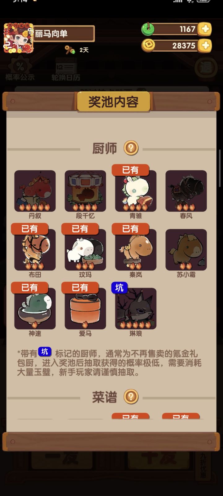 悲,不是炒果。首先看桌子,粗算日均231玉璧,和三国桌并列第一,可喜可贺。并且三国是上下限方差极大的赌桌,马年桌相比起来更稳定些。然后看厨具,技法增加+调料基础售价增加。按调料分类的售价通常会比按技法分类的售价适配范围更窄,应用价值更低。除非能精准地卡到某个厨子最适配的一到两道菜,否则这类厨具就会食之无味,弃之可惜。最后看菜。刚开始看到这个五分半的时长时我是不太满意的,和去年几个三分半/四分