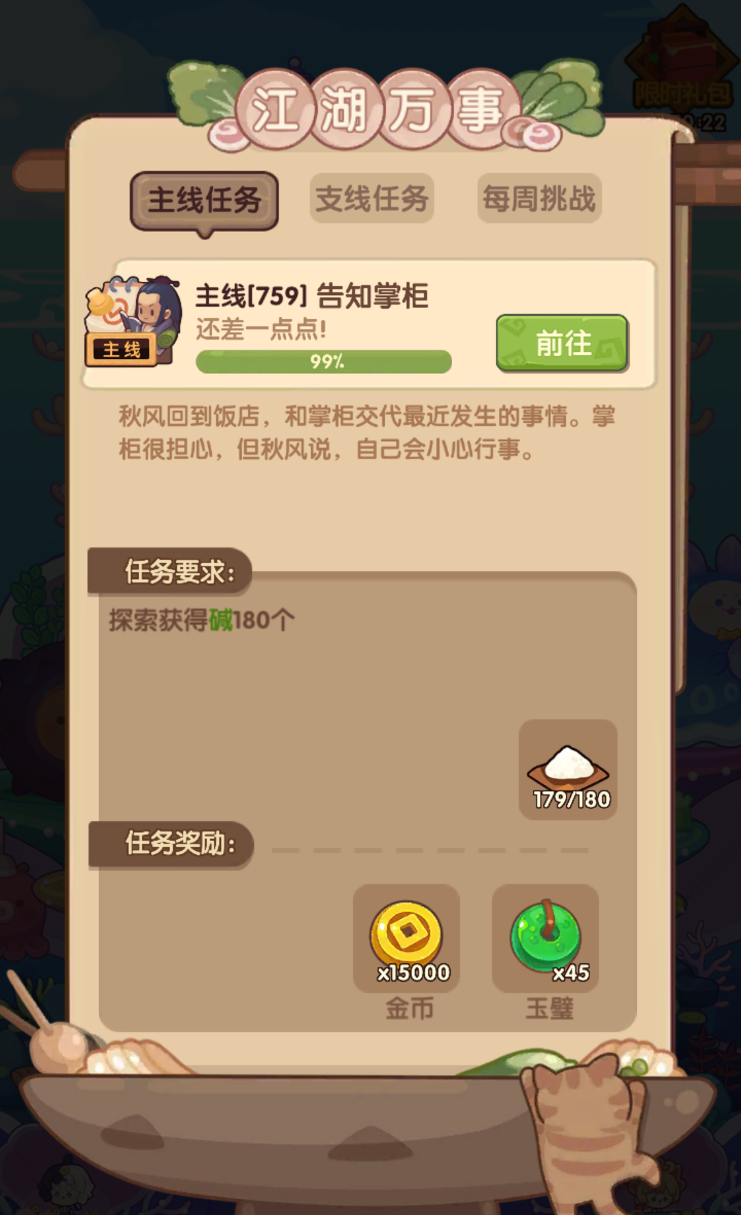 2025.12.18游戏天数167,主线551厨师136,4礼包厨(2刺客1贵客),6r×3(黑风、孑子推、三太子),周常大奖×2(雷角、谛天)在论坛里搜了一下,最快的300厨达成时间是300天,但是这位是巨氪所以不考虑;其次是450天,没抽过坑,氪了6礼包厨刚好凑够。以此类推,我个人的情况应该是在400-500天内凑齐(范围太大了吧喂)。参考300天佬的攻略,他在主线550-800用时4