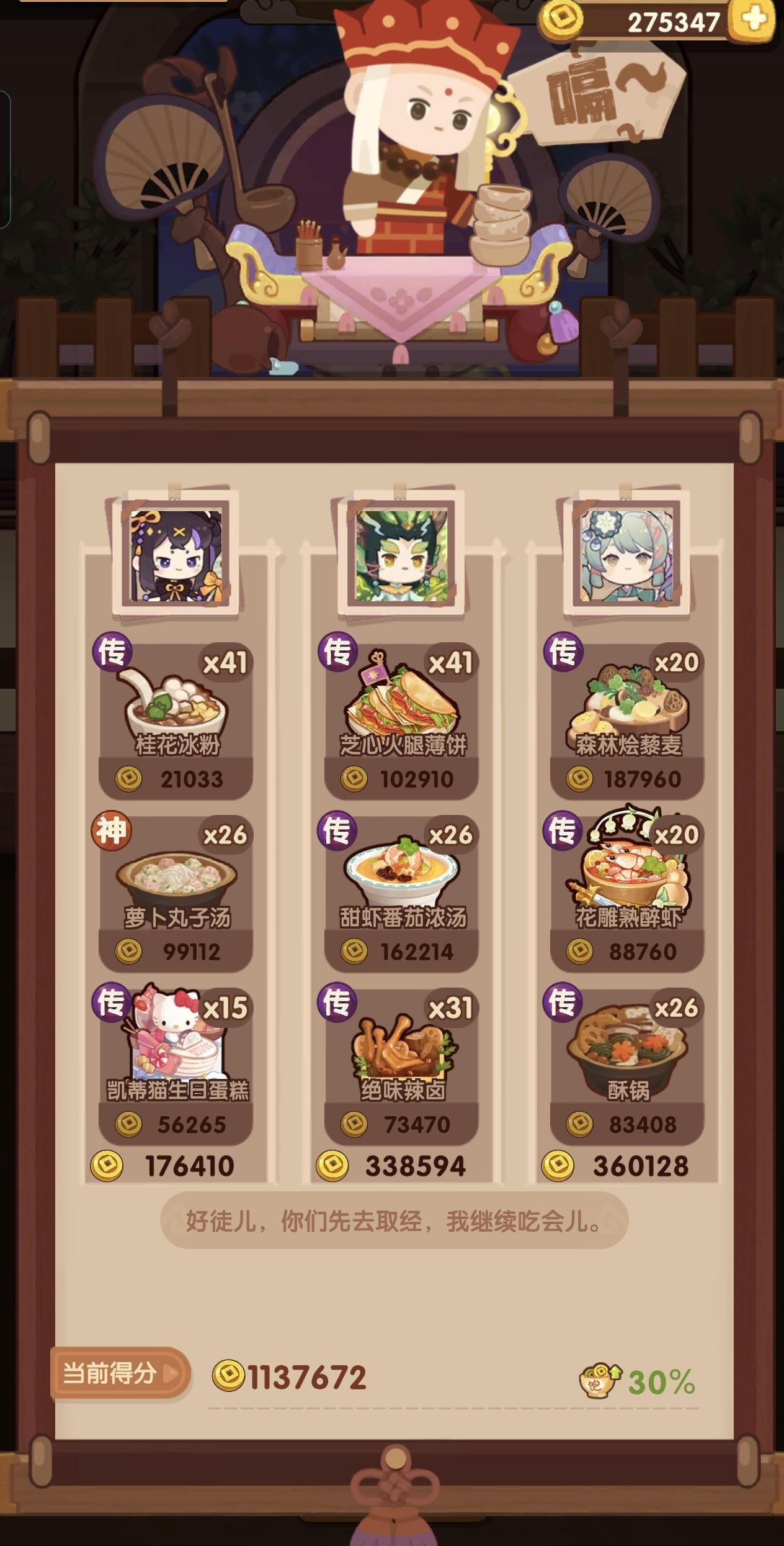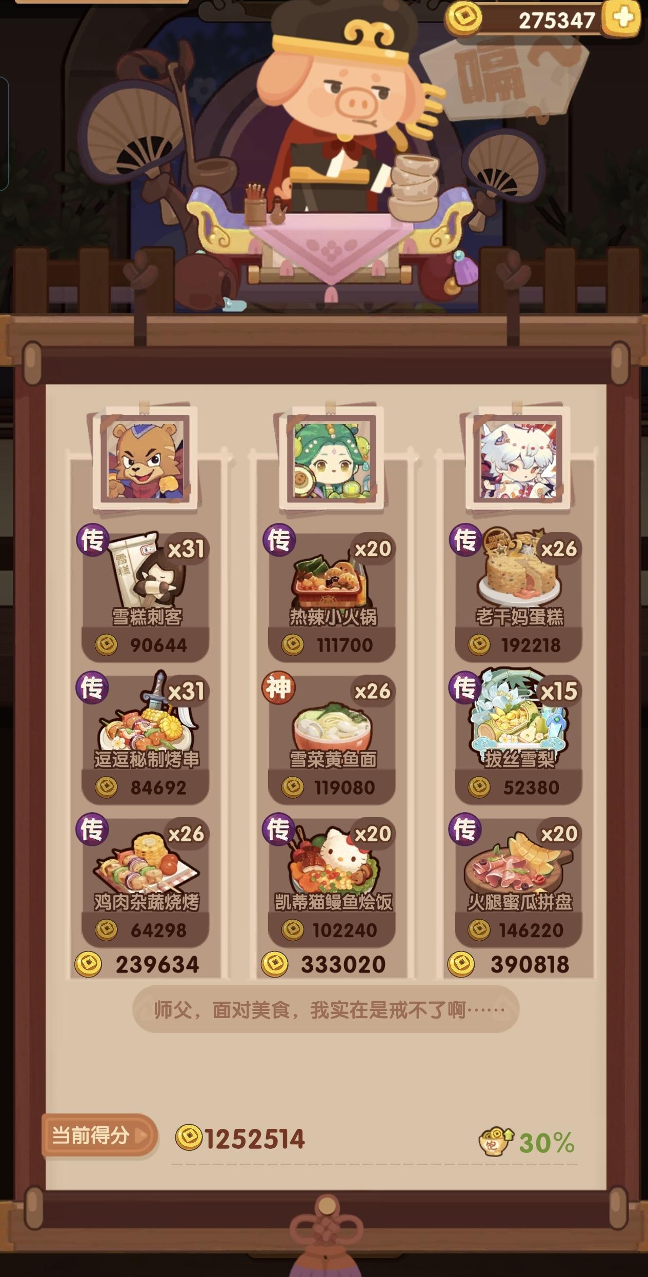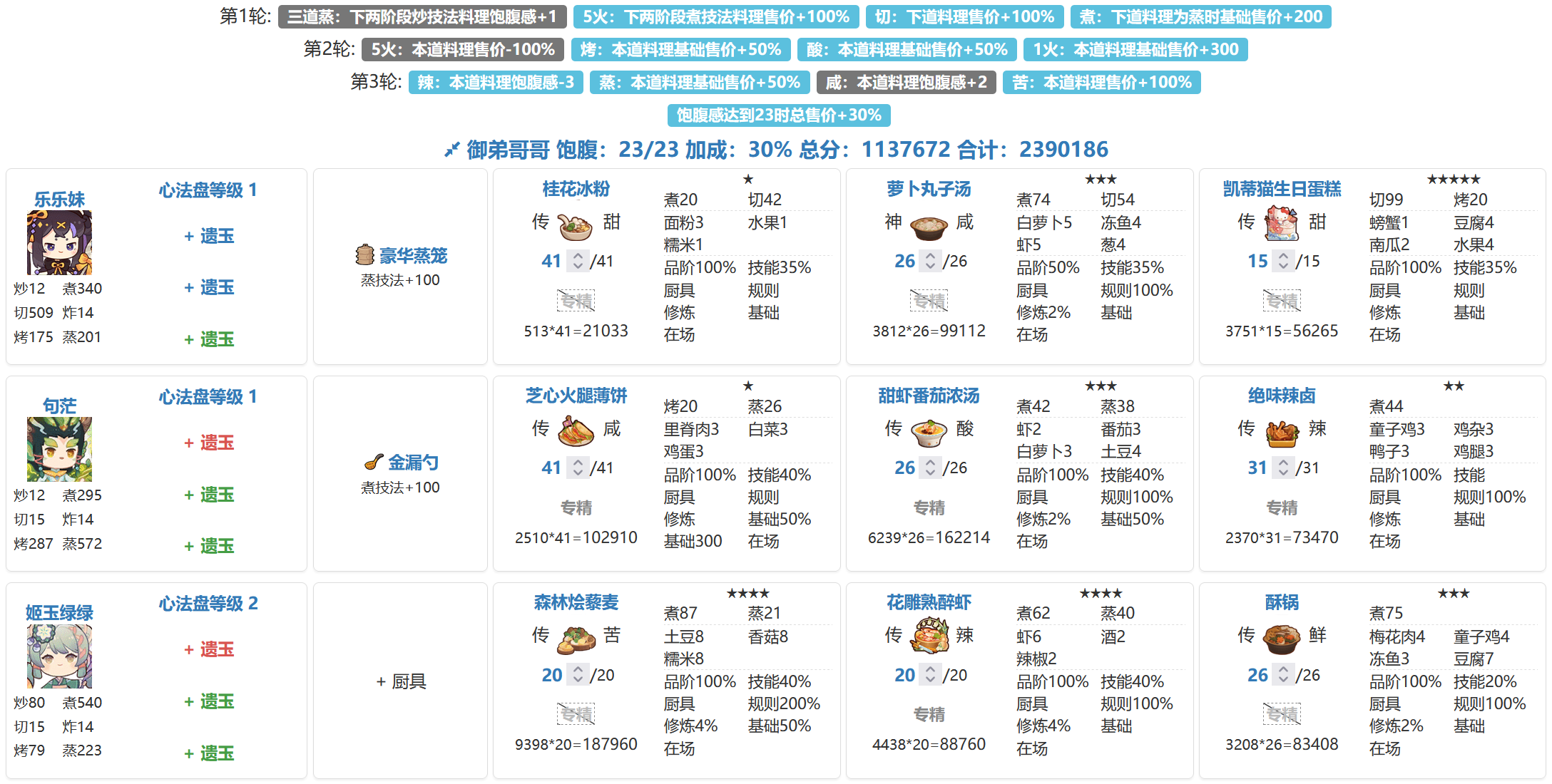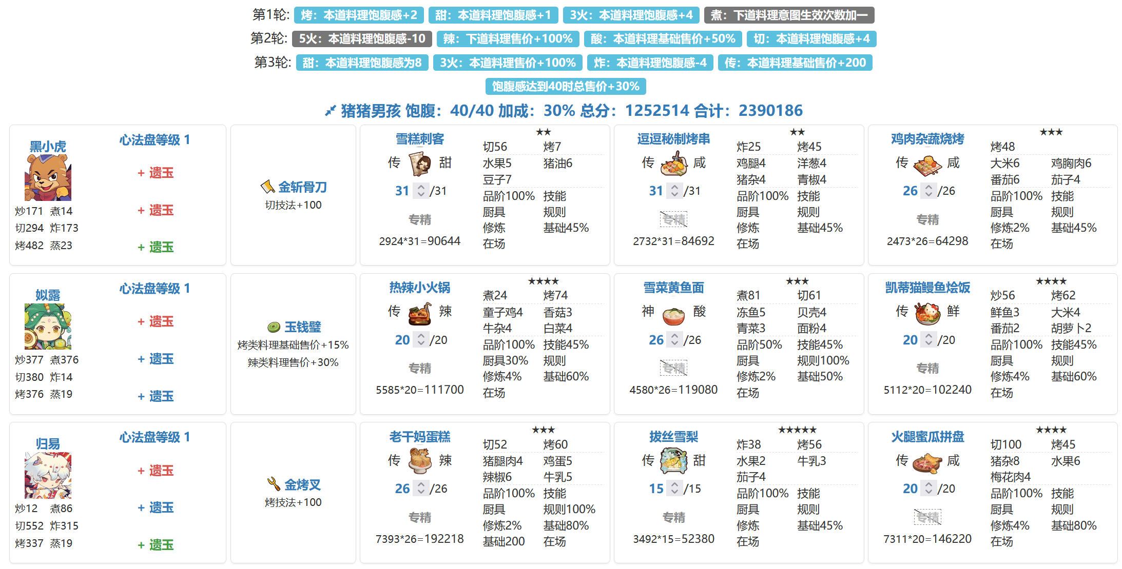虽然是州级宴会,但是分数已经239w省满(省5线205.2w,萌新的第一次省满)。宴会思路记录,同时抛砖引玉,能对相似进度小伙伴有启发最好!修炼了第一个五火厨【归易】,带上金烤叉已经可以把大部分【烤,切】菜做到传啦,配合【黑小虎】嘎嘎乱杀!猪猪男孩:1. 该贵客的40饱食度上限是个大胃王,但是好在加饱食度的贵客意图众多,因此凑满饱食上限并不至于捉襟见肘