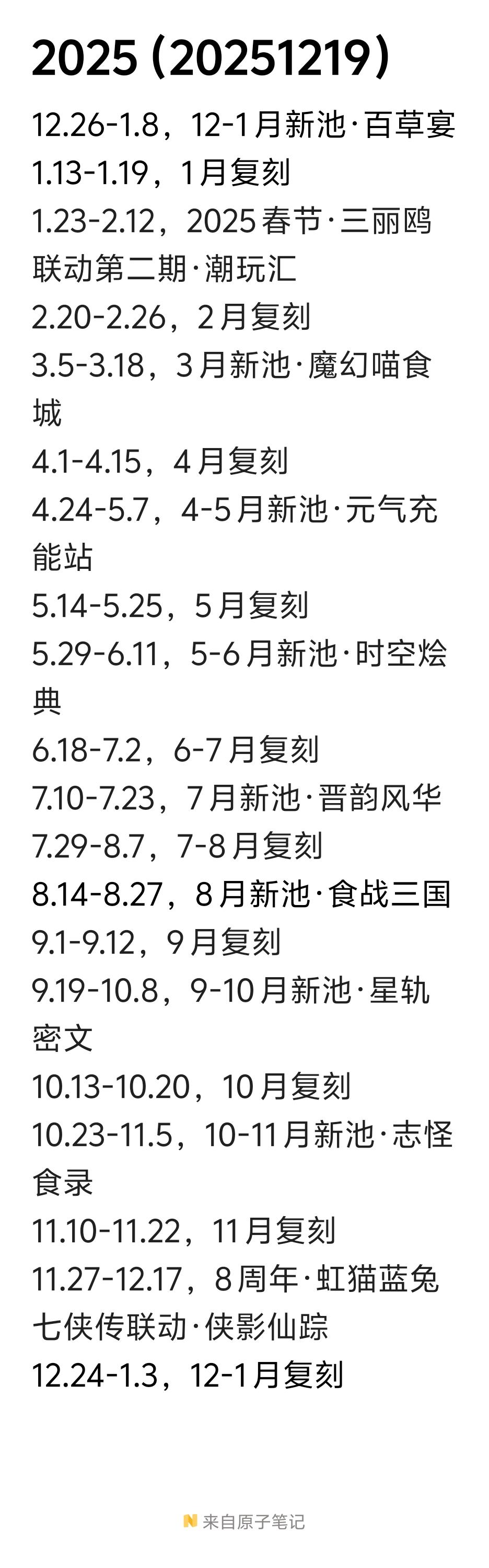 12.26-1.8,12-1月新池·百草宴1.13-1.19,1月复刻1.23-2.12,2025春节·三丽鸥联动第二期·潮玩汇2.20-2.26,2月复刻3.5-3.18,3月新池·魔幻喵食城4.1-4.15,4月复刻4.24-5.7,4-5月新池·元气充能站5.14-5.25,5月复刻5.29-6.11,5-6月新池·时空烩典6.18-7.2,6-7月复刻7.10-7.23