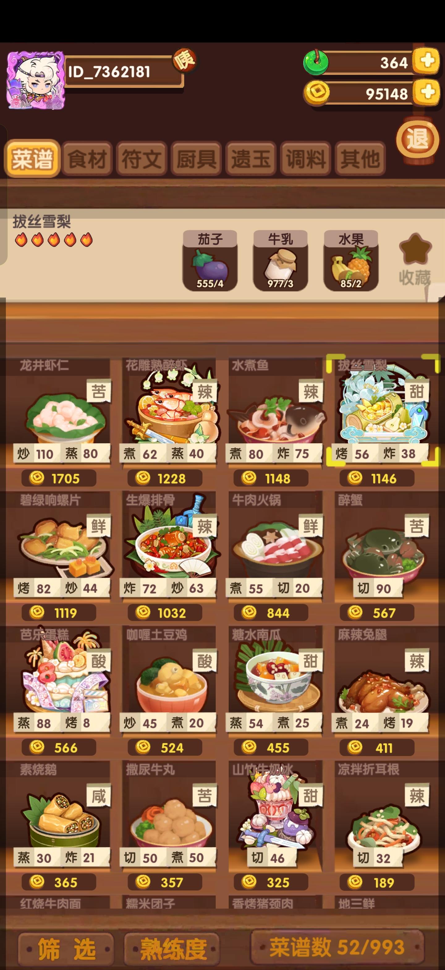 入坑大概半年都是零零散散的抽卡,晋韵风华开始抽新池(除坑抽完五个新池),只补了尚添和双十一(这两个也是差一点没有补完)。很想补金符文菜,没有利刃菜想补情人节池松鼠桂鱼。然后也没有贵客厨,很想抽几下子元气池林世恭(如果复刻应该也只能抽几抽刚把玉都花完了)。又刷到琳琅入坑很建议抽,非常想要那个全技法光环,因为现在还修不了几个厨师,五火都没修,四火修了几个,混沌子现在都还修炼不了,但是琳琅也差两个