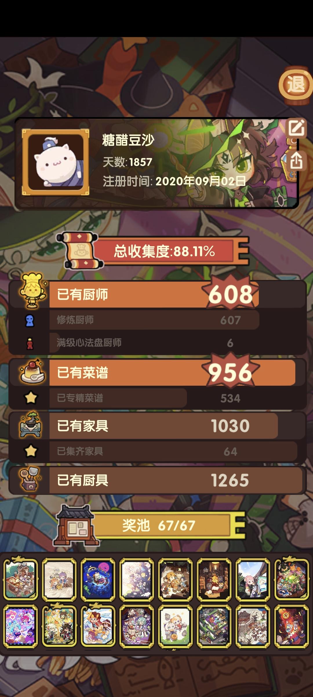 入坑大概半年都是零零散散的抽卡,晋韵风华开始抽新池(除坑抽完五个新池),只补了尚添和双十一(这两个也是差一点没有补完)。很想补金符文菜,没有利刃菜想补情人节池松鼠桂鱼。然后也没有贵客厨,很想抽几下子元气池林世恭(如果复刻应该也只能抽几抽刚把玉都花完了)。又刷到琳琅入坑很建议抽,非常想要那个全技法光环,因为现在还修不了几个厨师,五火都没修,四火修了几个,混沌子现在都还修炼不了,但是琳琅也差两个