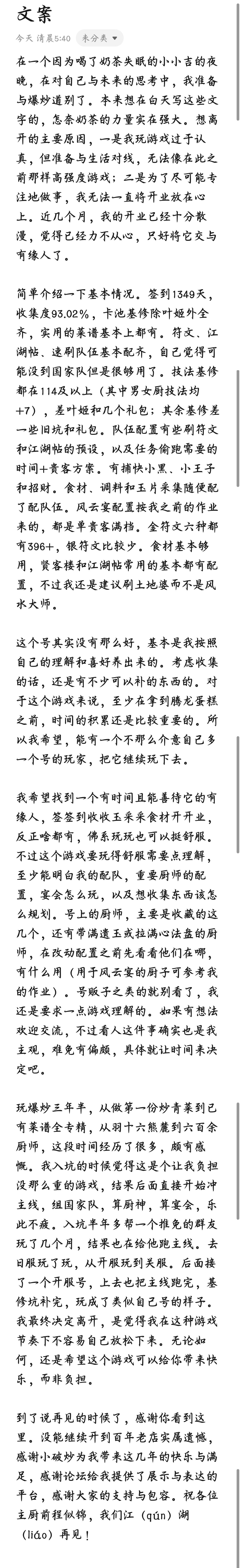 入坑大概半年都是零零散散的抽卡,晋韵风华开始抽新池(除坑抽完五个新池),只补了尚添和双十一(这两个也是差一点没有补完)。很想补金符文菜,没有利刃菜想补情人节池松鼠桂鱼。然后也没有贵客厨,很想抽几下子元气池林世恭(如果复刻应该也只能抽几抽刚把玉都花完了)。又刷到琳琅入坑很建议抽,非常想要那个全技法光环,因为现在还修不了几个厨师,五火都没修,四火修了几个,混沌子现在都还修炼不了,但是琳琅也差两个
