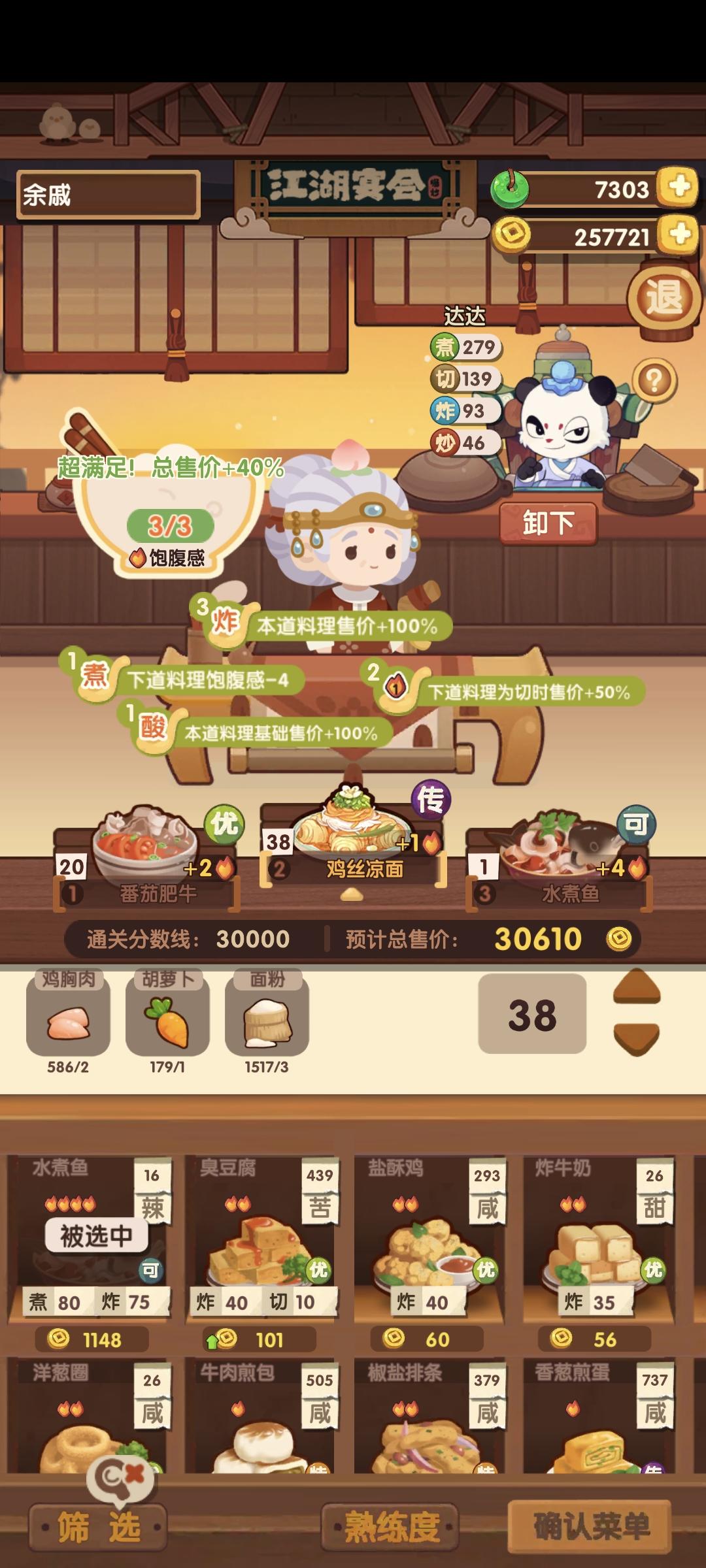 虽然是州级宴会,但是分数已经239w省满(省5线205.2w,萌新的第一次省满)。宴会思路记录,同时抛砖引玉,能对相似进度小伙伴有启发最好!修炼了第一个五火厨【归易】,带上金烤叉已经可以把大部分【烤,切】菜做到传啦,配合【黑小虎】嘎嘎乱杀!猪猪男孩:1. 该贵客的40饱食度上限是个大胃王,但是好在加饱食度的贵客意图众多,因此凑满饱食上限并不至于捉襟见肘