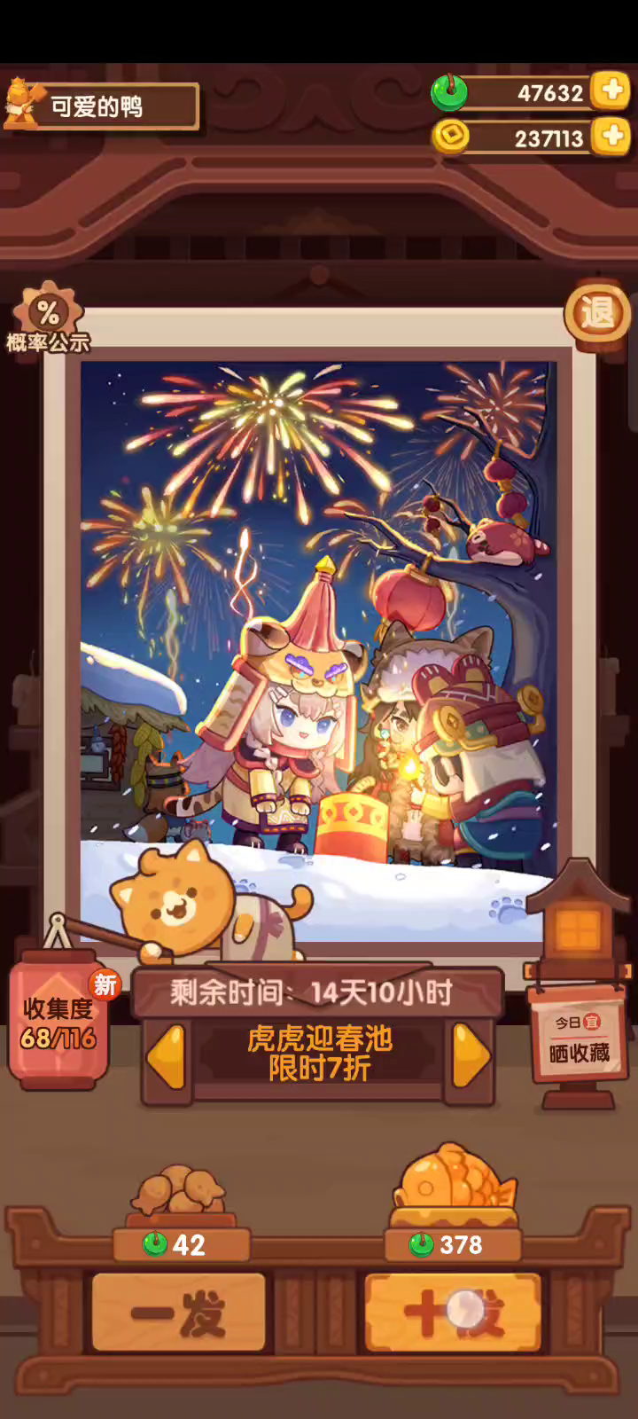 抽了90发虎年,除了礼包结束了,剩下抽了41发端午,才发现我端午一共要200多。。。而狗年只要56。。。我又选错了😭