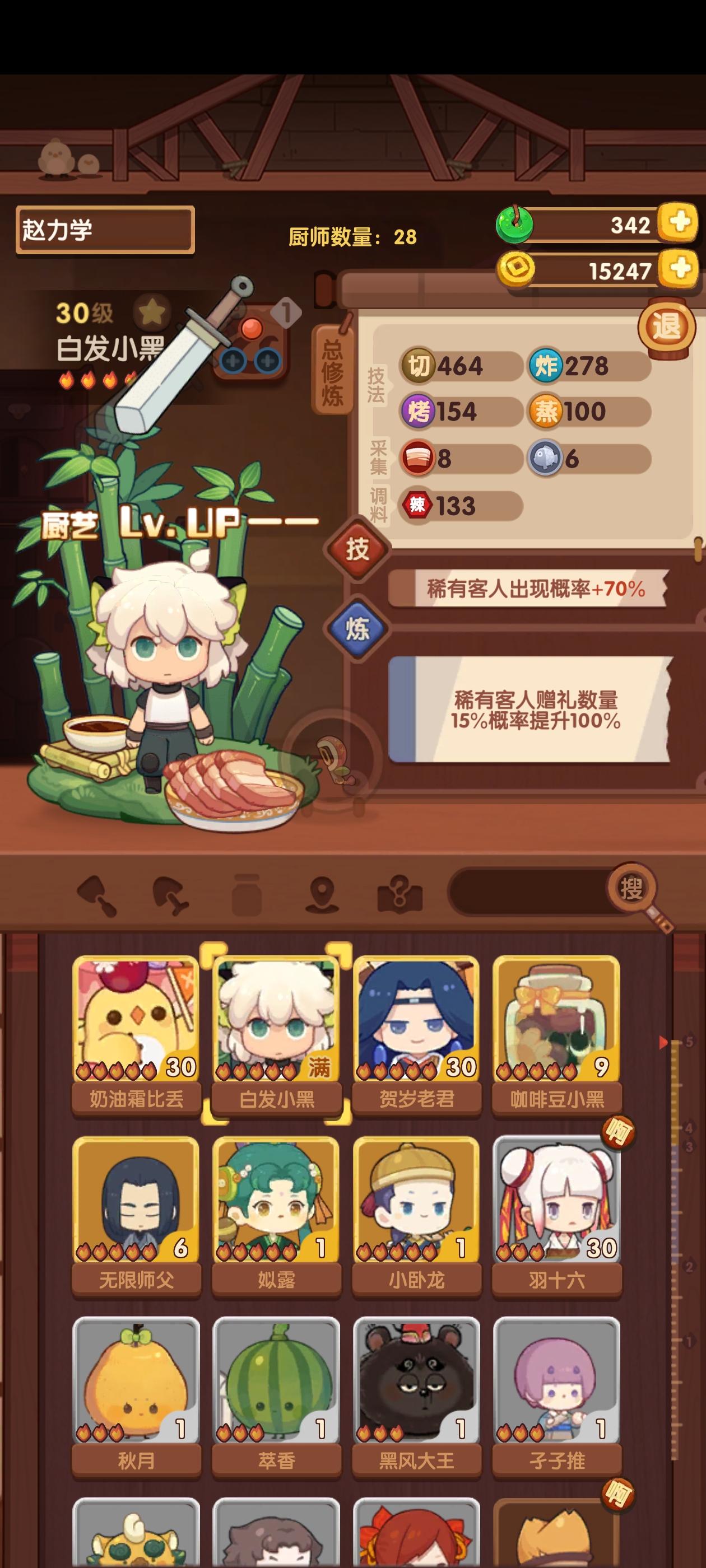 入坑马上一周了,最初是看见虹猫蓝兔联动入的坑,但是入坑时错过了礼包,但是听说礼包会复刻就留下来了,然后发现还有小黑联动真的惊喜,氪了几个小黑礼包和抽了几个角色,未来准备等琳琅和虹猫蓝兔礼包,但是现在完全不知道该先养谁,大佬看看这些厨师先养哪一个嗷。