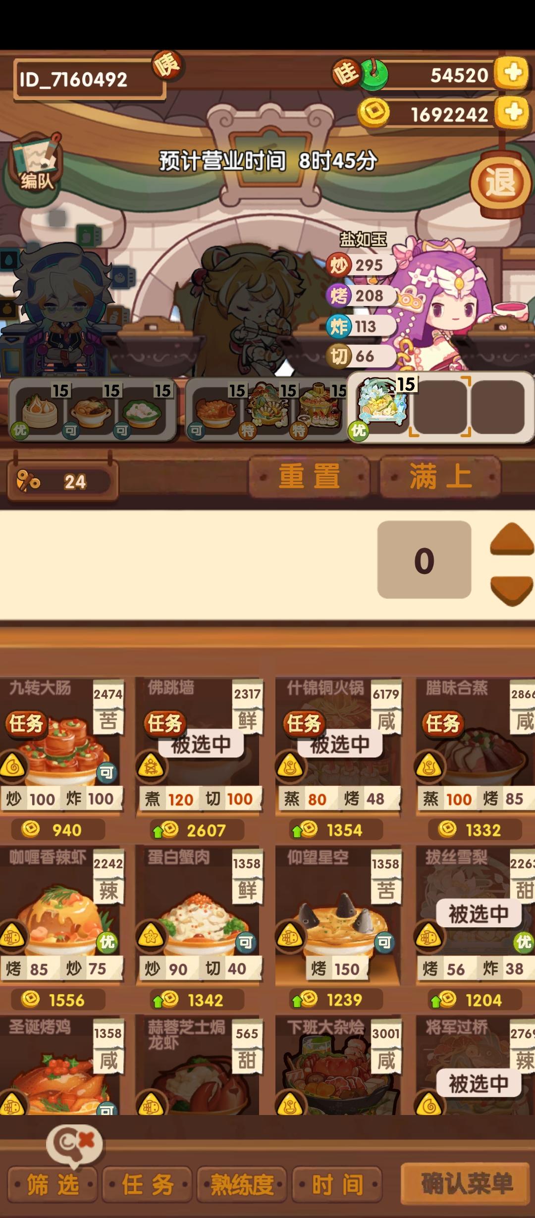 时间过得好快啊,不知不觉,佛系地玩了一年啦!抽了16个池子,拥有了217位厨师,拥有了429道菜。只买过4个厨师(凯蒂猫、小当家、黑熊、哪吒),拥有了自己的国家队:凯蒂猫:技能70%+巧克力礼盒80%+心法盘18%+心法盘18%=186%刘昴星:修炼120%+心法盘18%=138%临时工:技能50%+金骰子60%+心法盘18%=128%贵客率=452%对于一个佛系萌新来说很够用啦。开