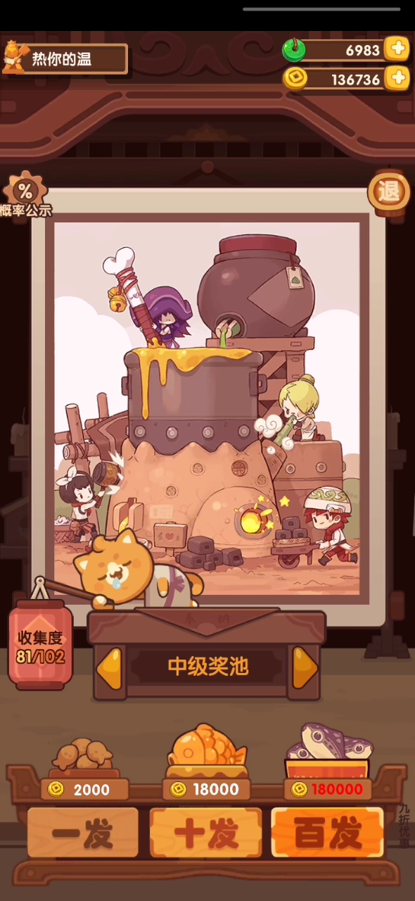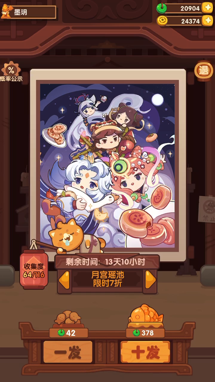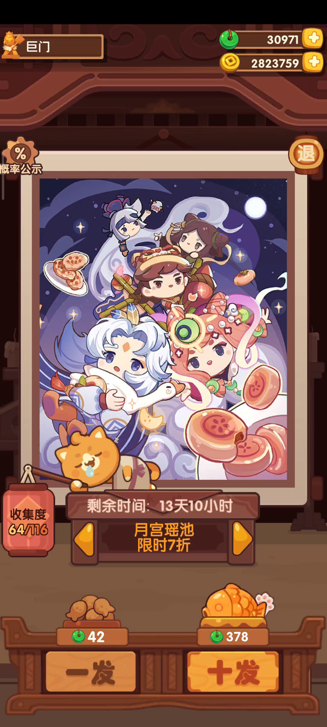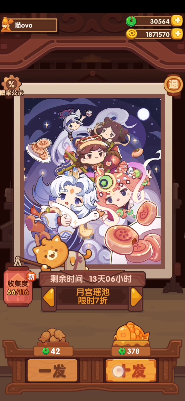 59发,未抽完,还剩一万钻打算等晚上继续抽 12发出常娥,36发出玉兔,可惜菜谱和我的缘分在后面,晚上再战