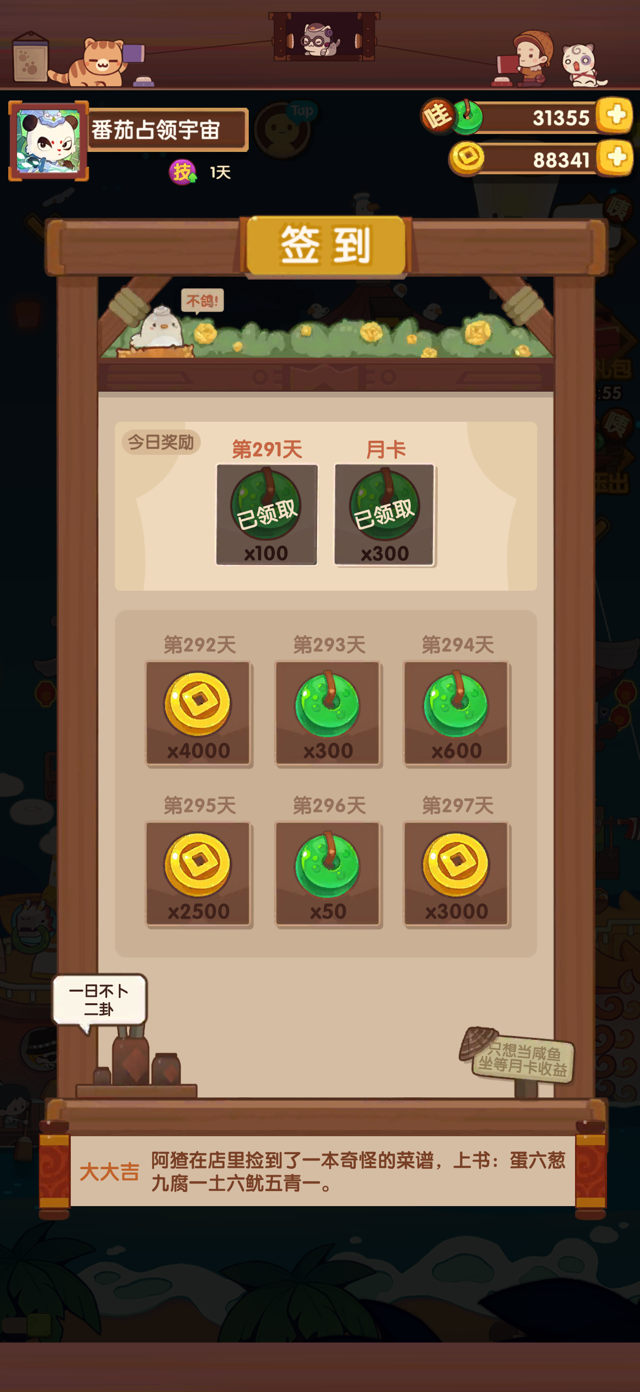 不知不觉天数也到三位数惹,这期间也走了不少弯路,绕的最弯的莫过于想抽一条龙,结果把瑞龙池抽完了,然后发现一条龙它根本用不着!再就是没注意情人节池是剧本,想着为了方便雪梨被削后用松鼠桂鱼刷玉,结果就抽完了,不过为什么情人节池少了一个装饰啊,顶上的锅子不是一套的真的不舒服再是这个月为了开始刷帖子,把江南烟雨除坑了,不过我还是挺喜欢这个餐厅的,也不亏,这几天下来刷了3270琉璃,第一次把遗玉换完50