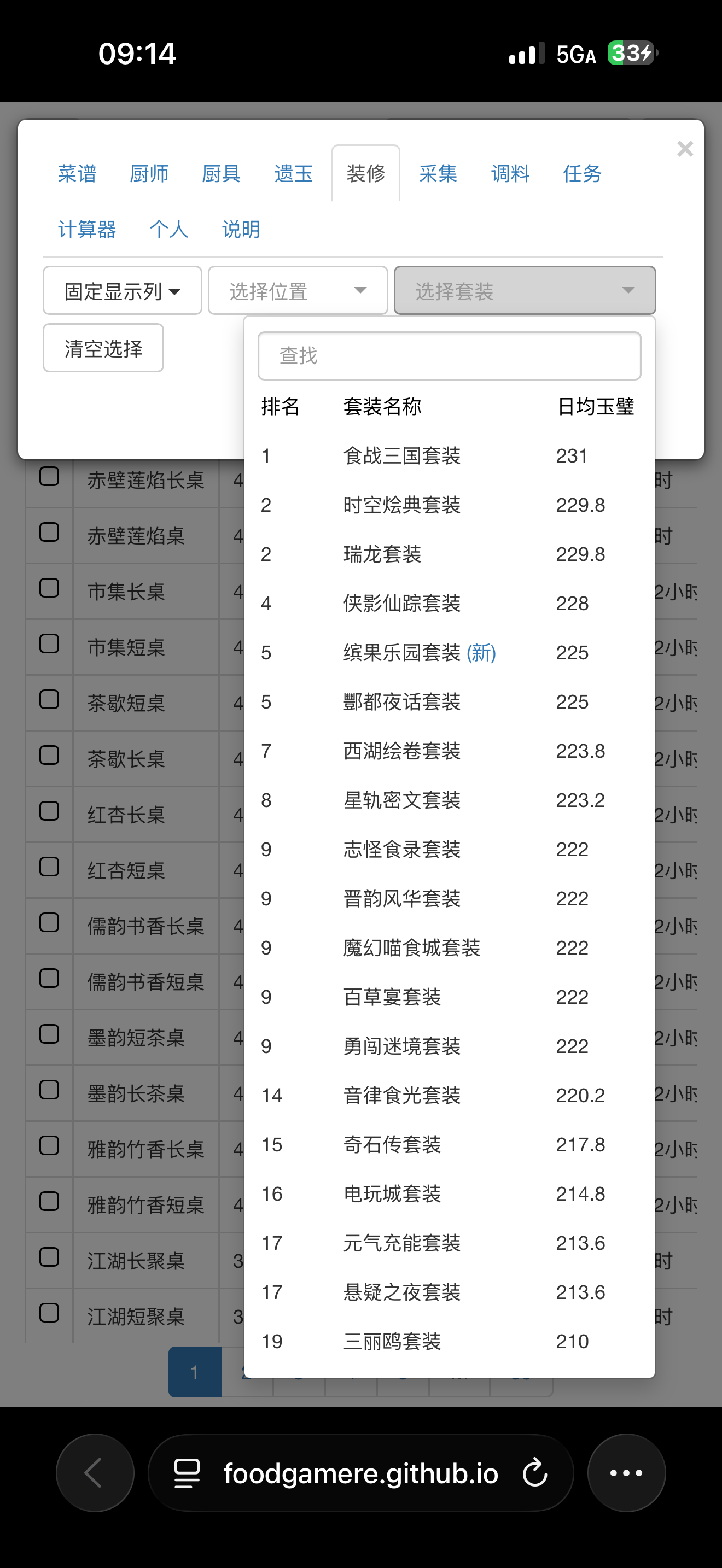 L佬辍更,众玩家失宴会算分之途,余不揣浅陋,愿承其任,续修此网,以飨同好。新网址foodgamere.github.io后续也会把轮椅的功能整合进图鉴网,轮椅猝~更新日志:2026.1.191.厨师新增采集组合查询、批量设置遗玉/厨具功能,(可自由组合快速查询玉片、调料排名)2.厨师新增采集期望值查询,值越大采集效率越高2026.1.16:1.计算器新增厨神大赛及限时任务2.装修