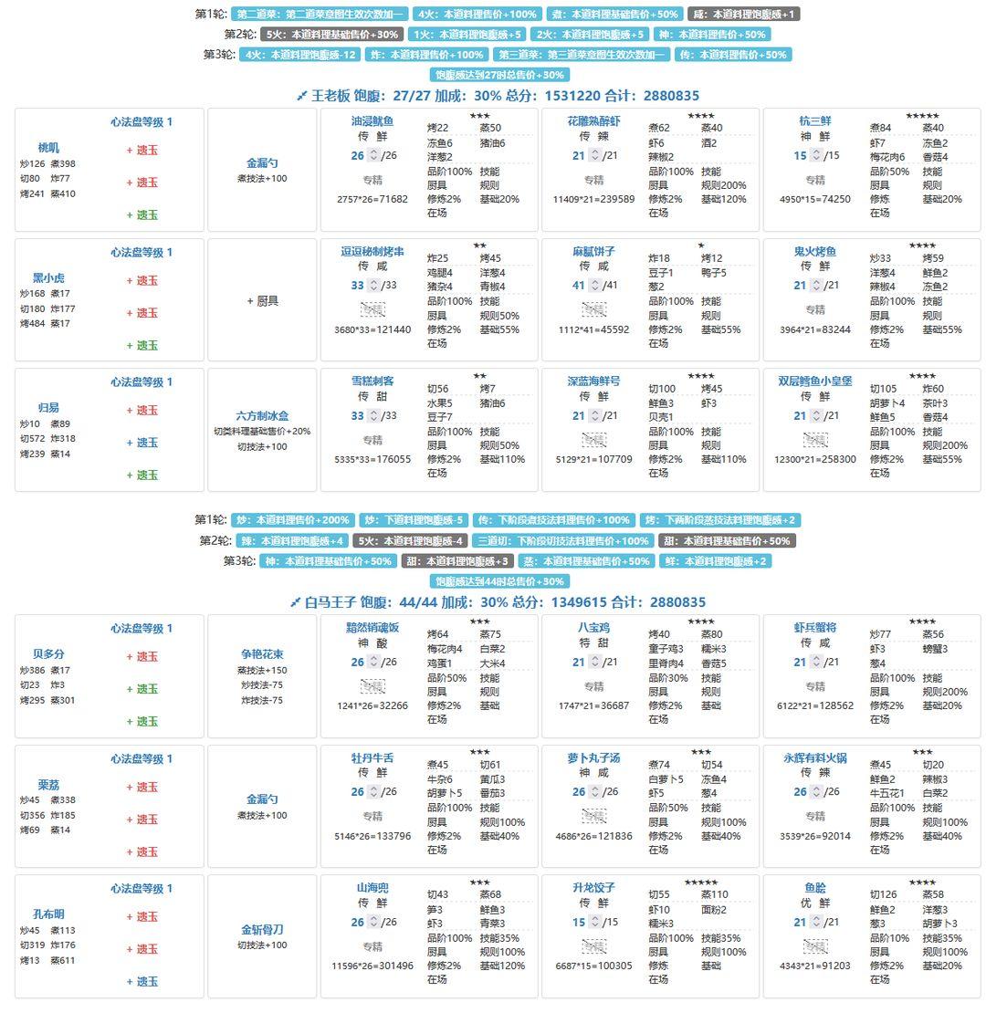 342.2w省满(省5线325.2w),缤果池菜厨表现亮眼!宴会思路记录,同时抛砖引玉能对相似进度小伙伴有启发最好!一个月前(20251212)有过一期【卷帘+御弟】,没想到这么快又重新轮到。当时只能州满,想省满代价很大,需要拉满所有上场厨子的心法盘并上满【席丰】。但此次作业加入缤果池的菜厨后,可以低成本轻松打满省满啦!宴会对技法的需求排序为【切】>【煮】>【烤】>【蒸】>【炒】>【炸】,对调