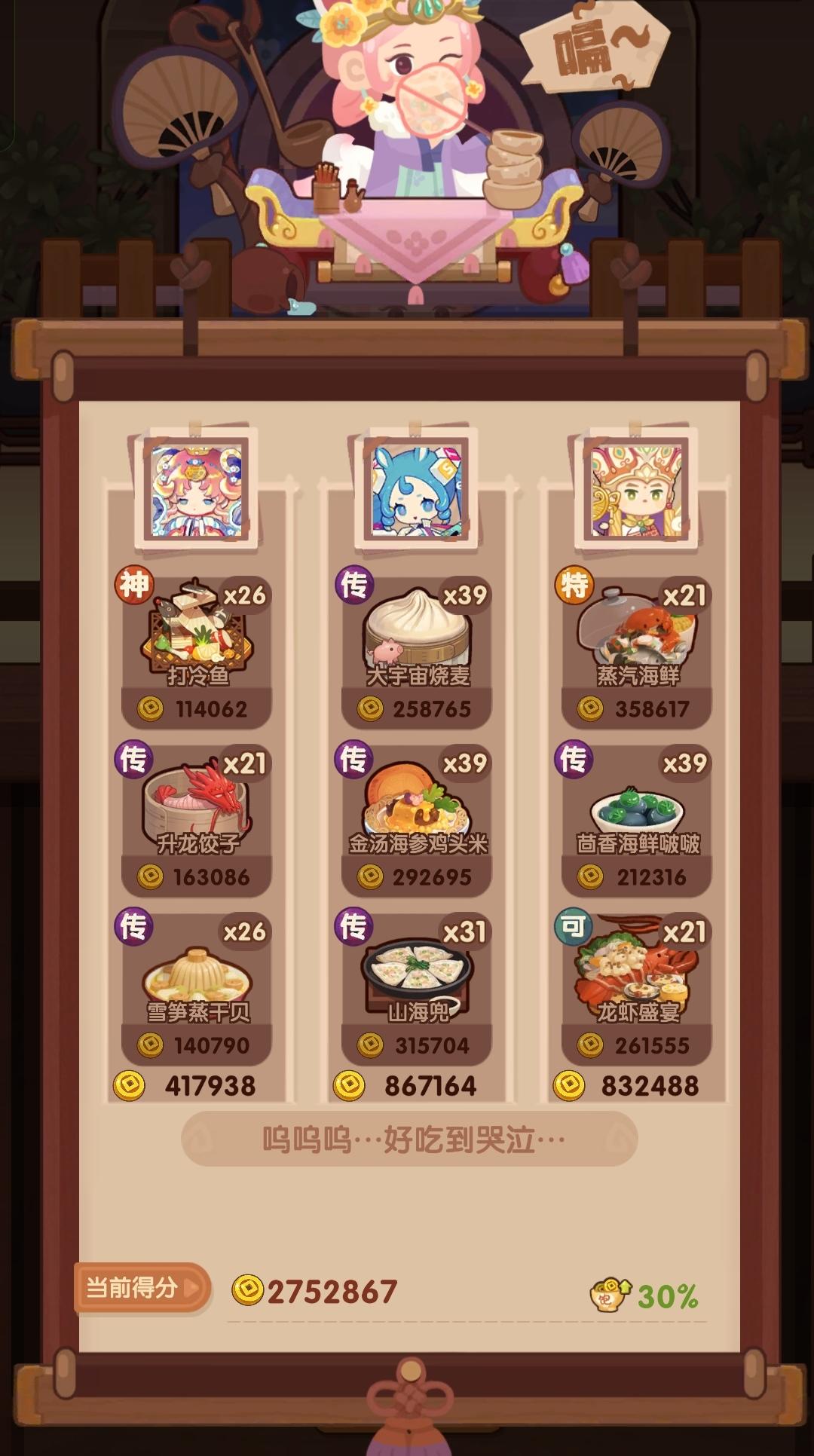 🧱前排提醒 ——满档分数线2621000 本期提供高分方案P1-3,其中P1与P3为单通方案,P2由于烤切环境不理想,单通需要上遗玉或者高售价厨具,省关键食材方案P4-5。 🌼【孔布明】推荐加【炒】技法厨具做【传】海参鸡米头,【唐三三】需要高基修才能做【酥炸蚝配鱼子酱】,自行根据基修情况上厨具,这道菜做不了起码少10万。 🌵P1-2菜谱优化 升龙饺子 下位🔥雪花鱼糕/年夜饭杭三鲜 下位🔥