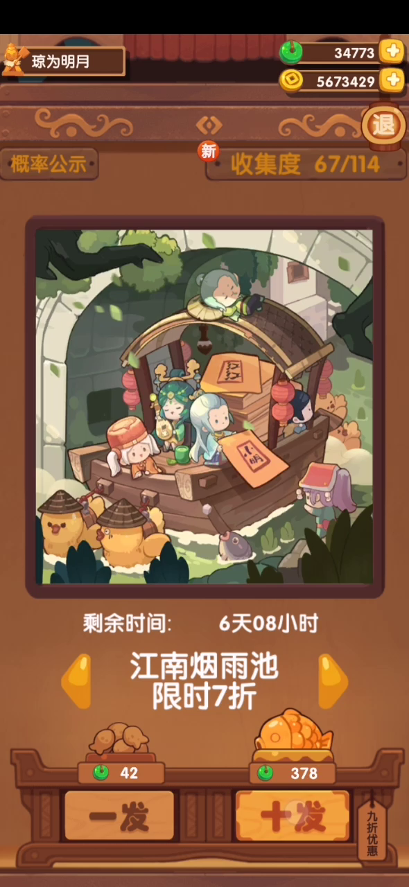 68之后又多抽了一发,总共69发,69*378=26082玉壁,还行吧,头一次这么快就全了的新池,五火厨师这次13发就出了,菜谱挺靠后的。