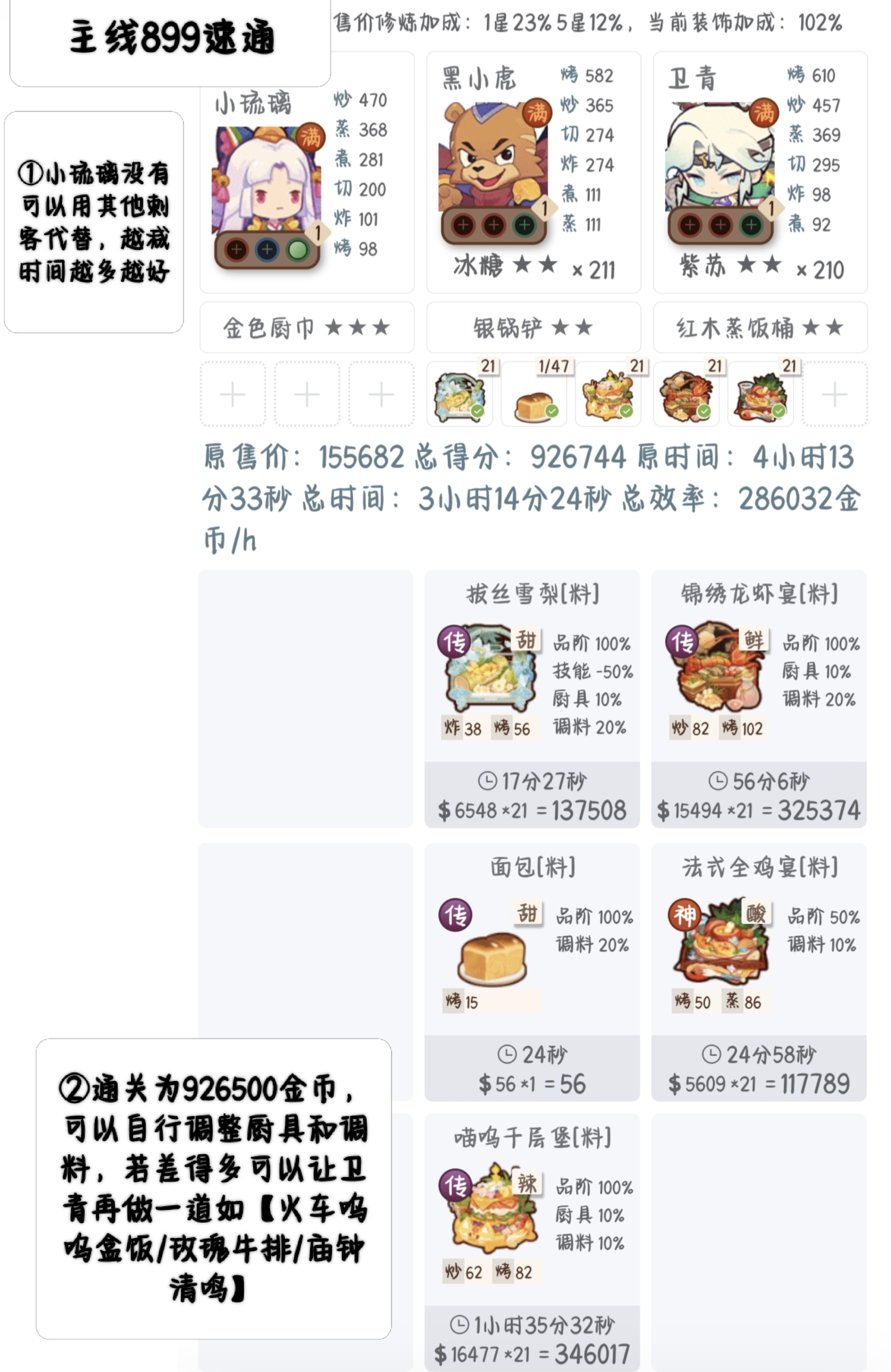 主线结束,后厨菜齐(25年10月就齐了,最后搞得是暖冬融雪(最没用的一道),神话池给我非的只剩3道菜才出牛肉泡馍),1335天的萌新终于可以养老了。🌹感谢图鉴及攻略大佬们的帮助,感谢神菜拔丝雪梨速刷897-898,虽然连点时光机真的累🌼P4附赠主线899速刷方案,试出来暂时这样最快(不用三星高售价厨具和遗玉)。