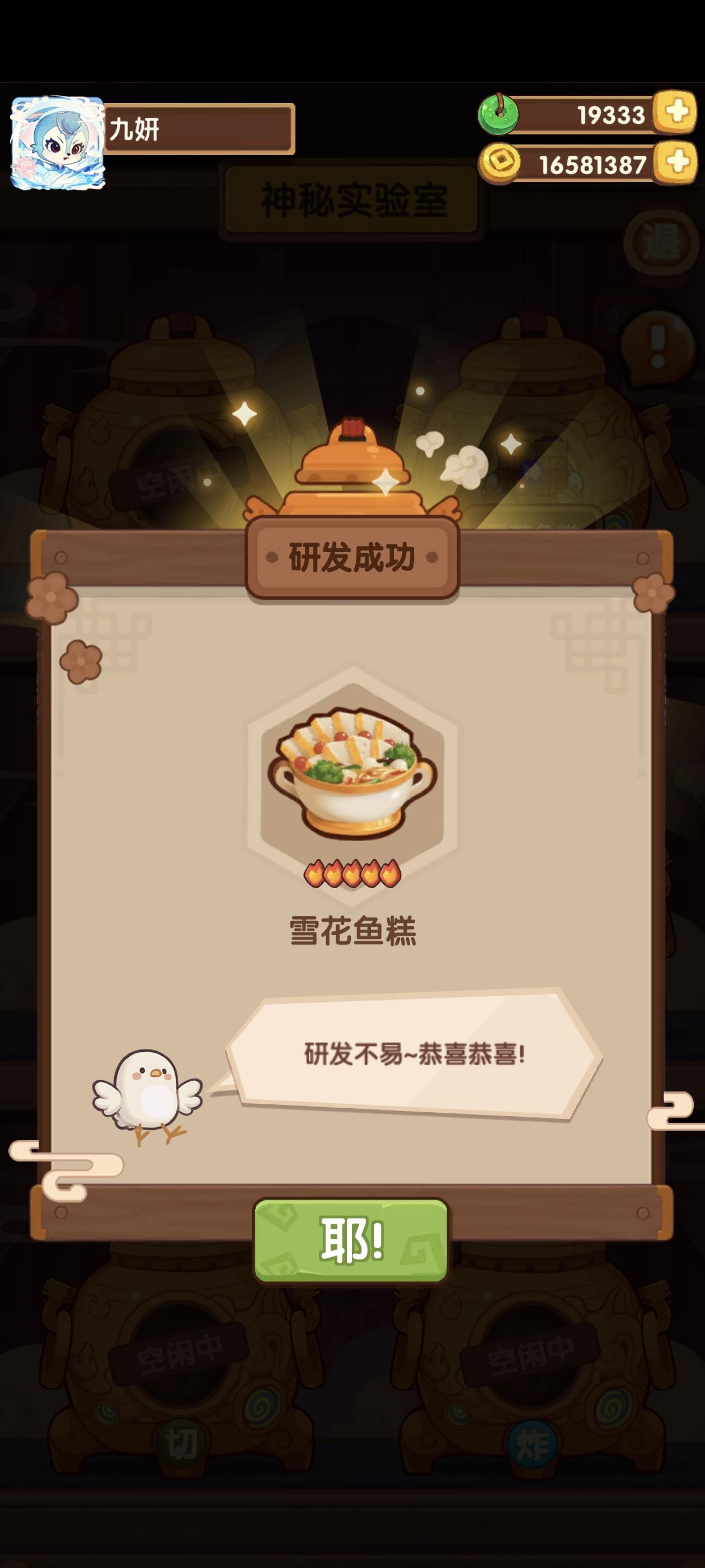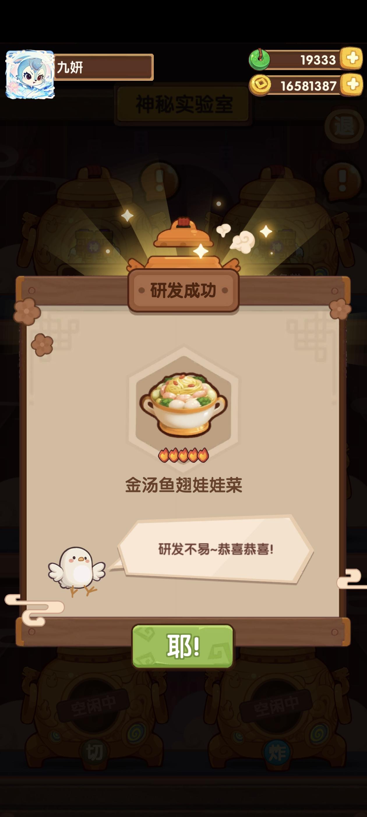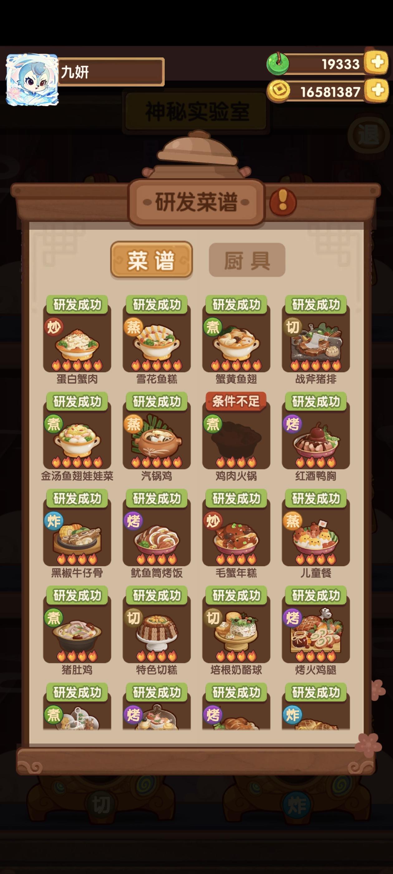没有保底!开心(∩_∩)实验室只差一个菜谱啦不过辣子鸡目前不会去捞,打算先捞清蒸武昌鱼、孔雀开屏、酸菜鱼