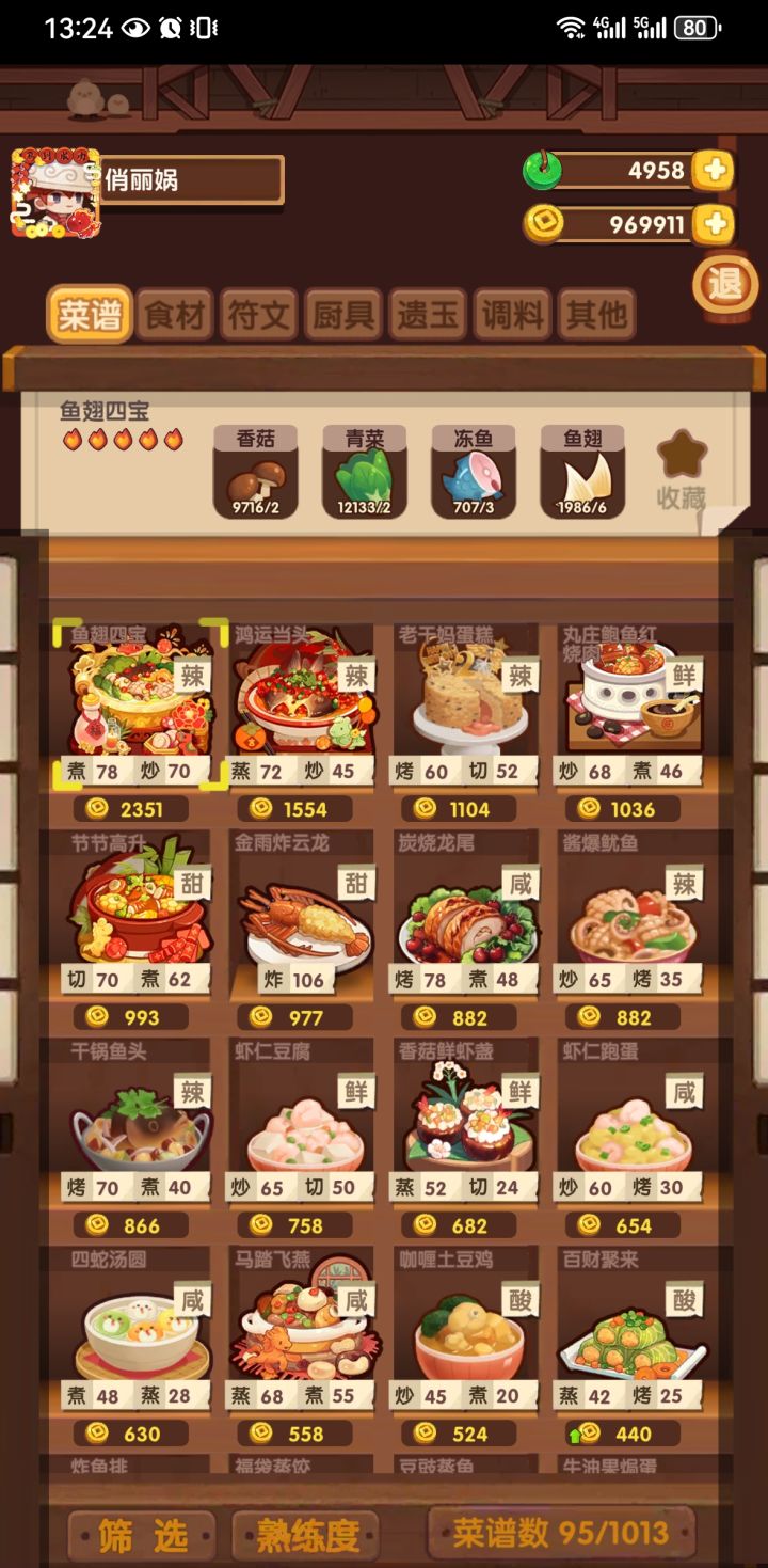 我拉琪的技能加修炼加成是72%,厨具纯加技法,炎罗总加成是158%,算起来生日蛋糕的售价在2882,雪糕刺客售价在2600,都是甜味切烤技传说级料理,为什么雪糕刺客比生日蛋糕在御前大赛的价格会贵到快三倍,这个到底是怎么算的,搞得每次过御前大赛都和抽奖一样,就看哪个菜手气好能抽到高价,但是又不可能一个一个试过去,有没有大哥帮忙解释一下