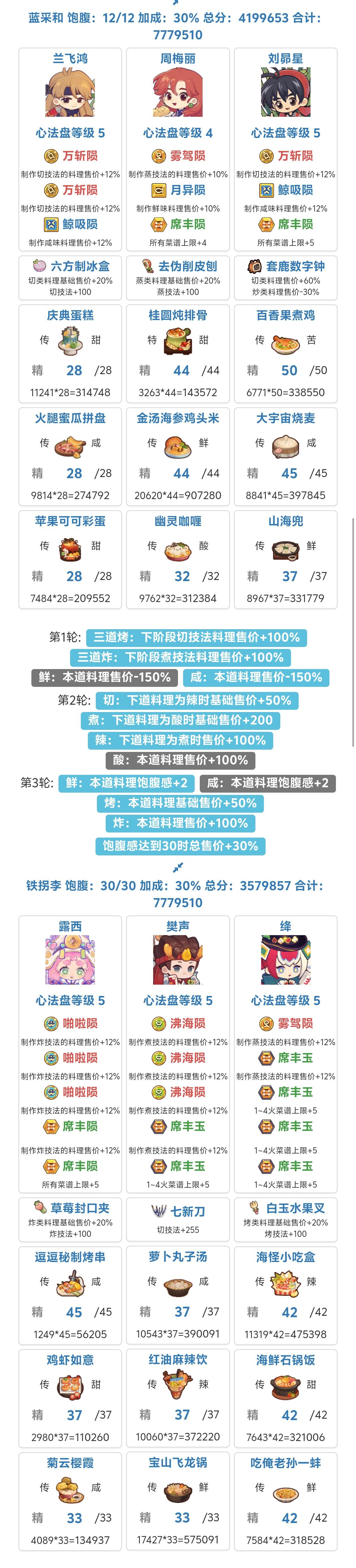342.2w省满(省5线325.2w),缤果池菜厨表现亮眼!宴会思路记录,同时抛砖引玉能对相似进度小伙伴有启发最好!一个月前(20251212)有过一期【卷帘+御弟】,没想到这么快又重新轮到。当时只能州满,想省满代价很大,需要拉满所有上场厨子的心法盘并上满【席丰】。但此次作业加入缤果池的菜厨后,可以低成本轻松打满省满啦!宴会对技法的需求排序为【切】>【煮】>【烤】>【蒸】>【炒】>【炸】,对调