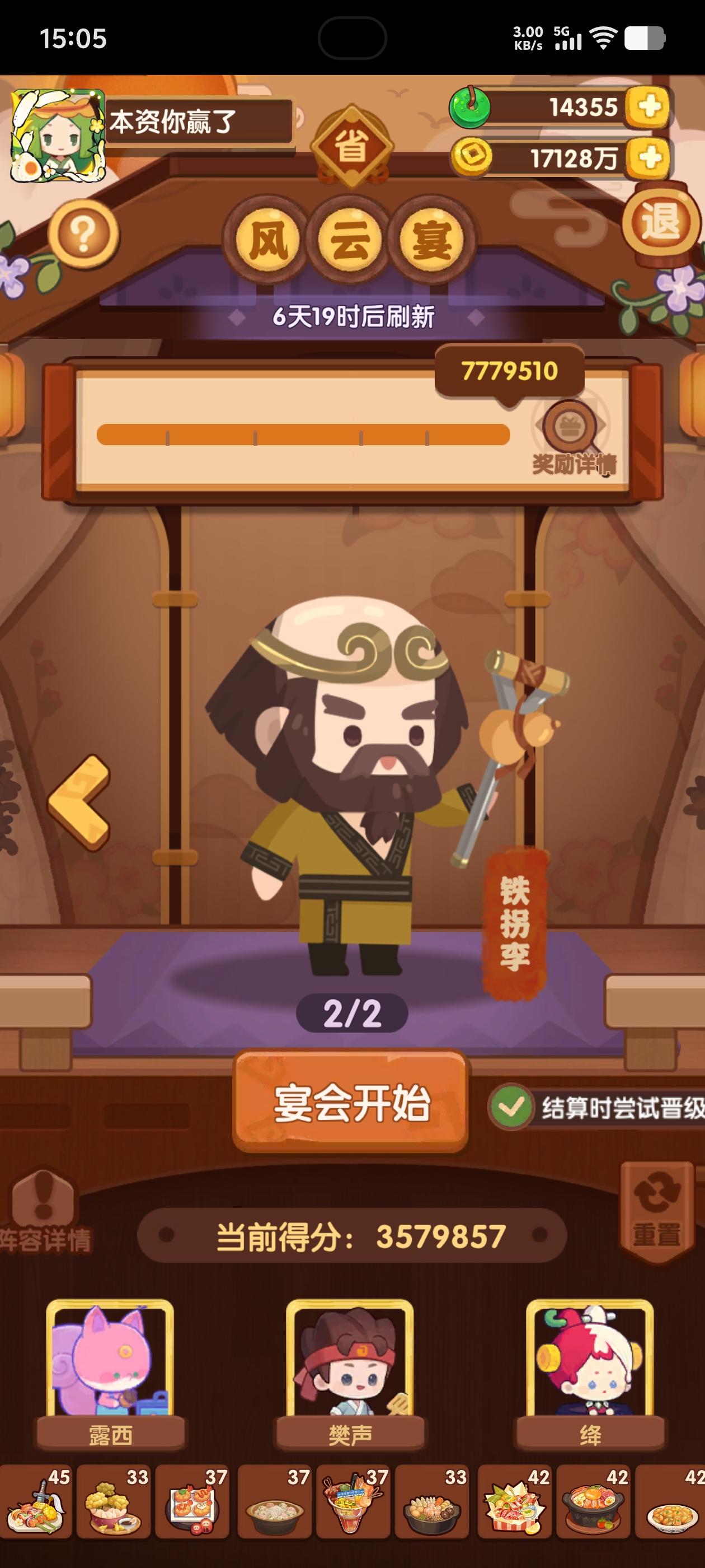 【蓝采和+铁拐李】有图鉴后确实方便多了,什么位置该上什么菜都一目了然。还有进步空间,这期一火菜百香果煮鸡c麻了,分数又高又减饱腹值,这就说明需要提一下一火菜的上限份数了(基修),然后煮切我用的樊声,还在用七新刀,切的基修不够,后面够了用黑猫香薰就行了,然后三火菜就用那个牡丹牛舌,因为黑猫香薰加鲜的基础售价,萝卜丸子汤吃不到,所以比不过牡丹牛舌