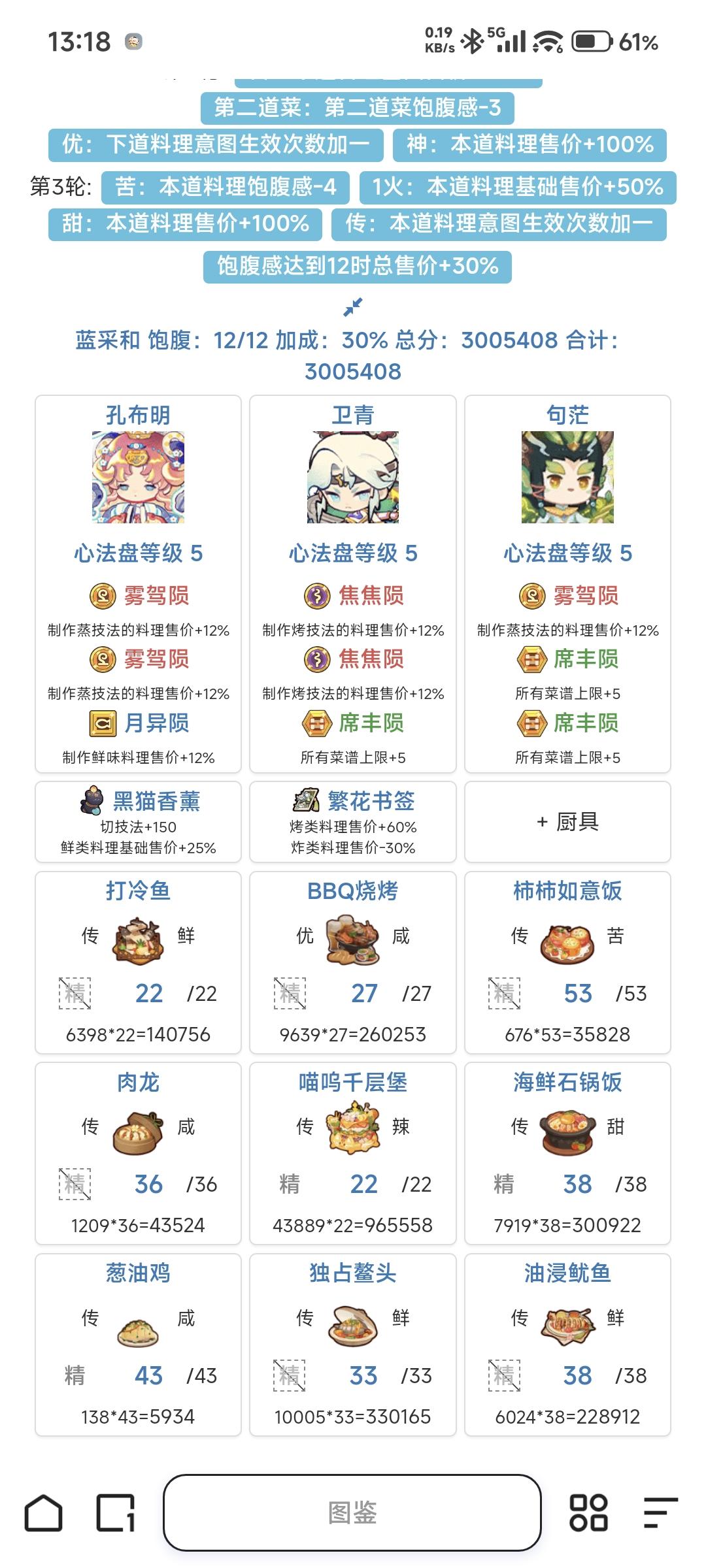 L佬辍更,众玩家失宴会算分之途,余不揣浅陋,愿承其任,续修此网,以飨同好。新网址:https://foodgamere.github.io/后续也会把轮椅的功能整合进图鉴网,轮椅猝~更新日志:2026.1.241.新增贵客率计算器(轮椅的自动查询功能还没加)2026.1.221.菜谱专精查询新增时间buff加成计算,勾选上场类技能的时间类厨师生效,已修炼的菜谱熟练度基修厨师也会生效