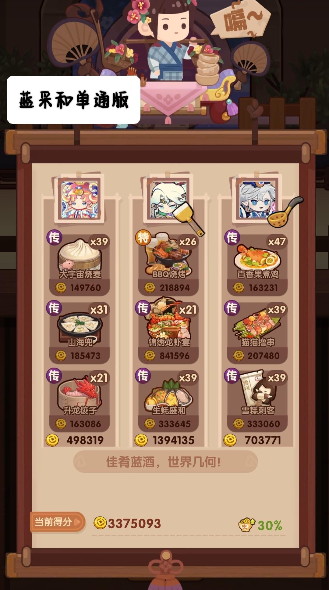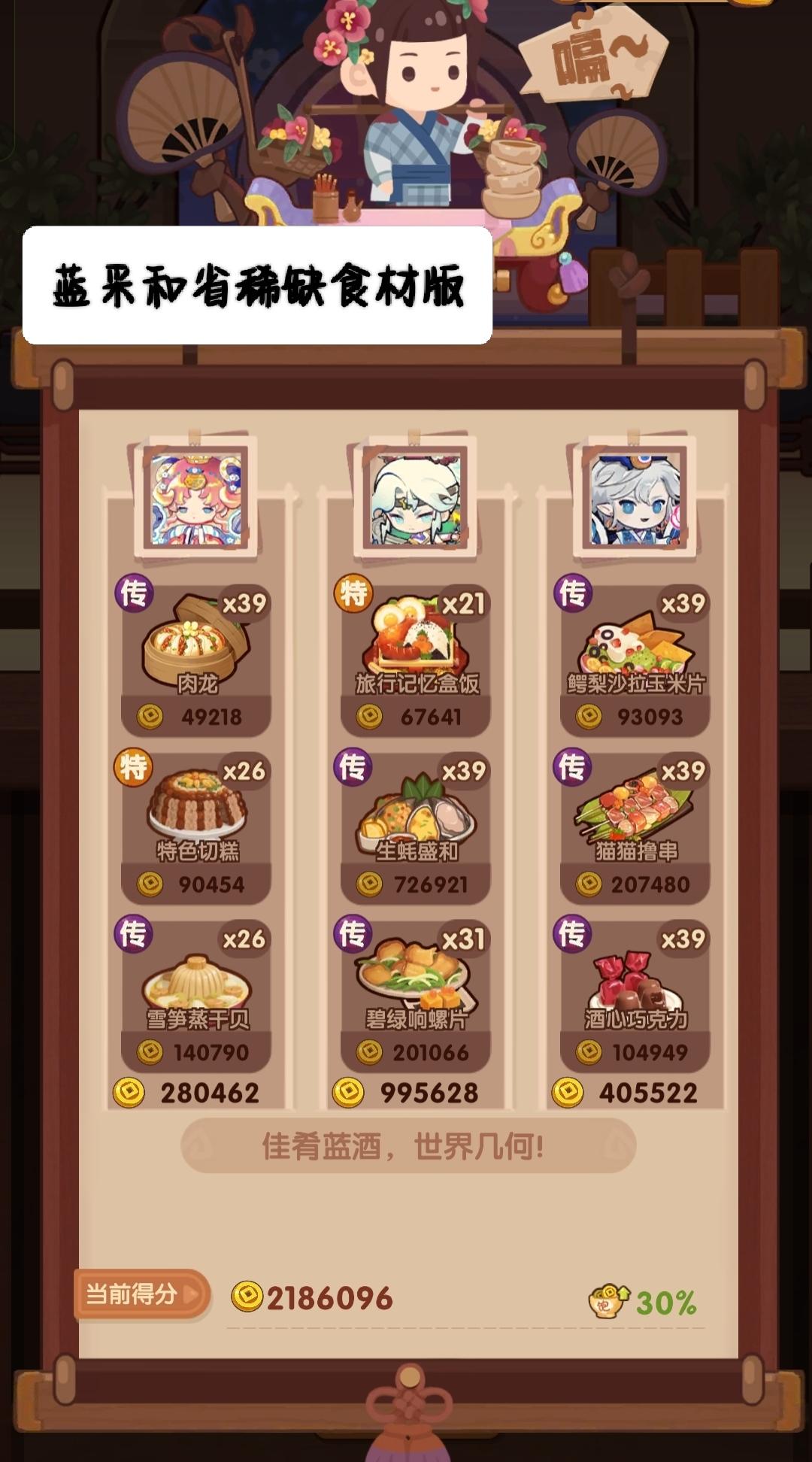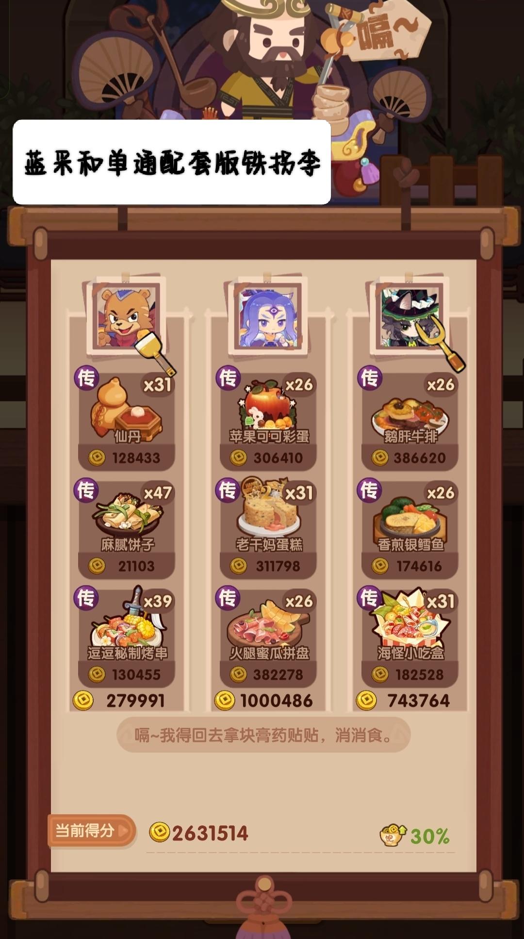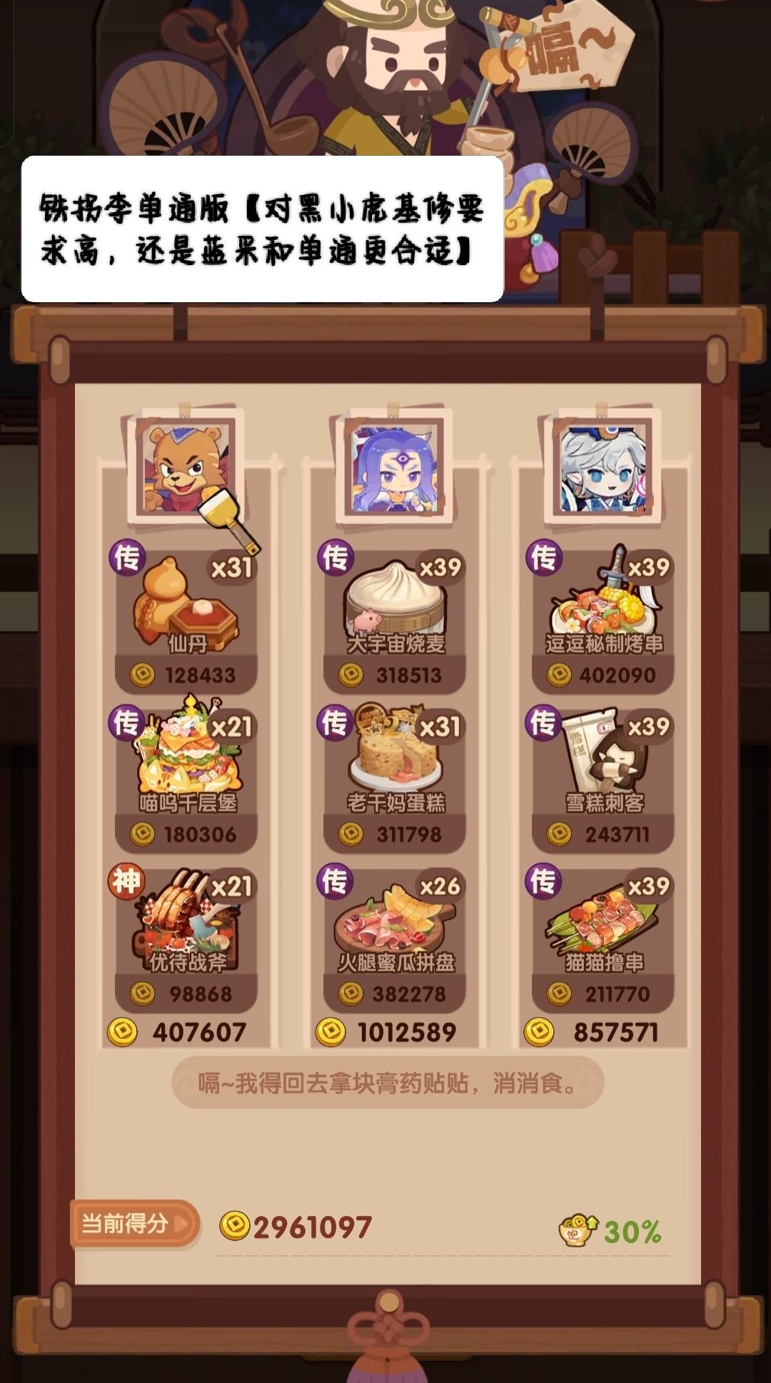 🧱前排提醒 ——满档分数线2930000 本期提供高分方案P1-3,其中P1与P3为单通方案,P3需要黑小虎高基修,故推荐用P1单通阵容,省关键食材方案P4-5。 🌵P1-2菜谱优化 生蚝盛和 下位🔥金汤鸡米头/蜜汁叉烧仙丹 下位🔥沙县轻食火腿蜜瓜 下位🔥庆典蛋糕/双层鳕鱼鹅肝牛排 下位🔥菊云樱霞/香煎鸡胸肉香煎银鳕鱼 下位🔥酥香鸭脯/果酱烧鹅🎃上期链接【提升超30万+】 🐍09