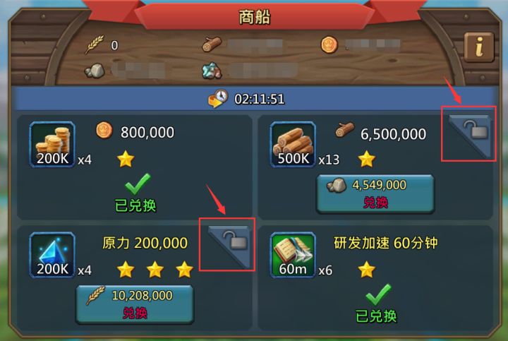 商船领地内有一个商船交换功能,可以使用资源去交换特定的物品,商船每6小时刷新一次,如果想保留住商品,在物品的右上角有一个锁头标志,点击即可锁定,不会被刷新;兑换的时候有机会刷出特殊惊喜,点击特殊惊喜图标左上角“放大镜”,即可查看当前的特殊惊喜物品内容,一份价值RMB 6元。商船刷出必买! 超值 !超值!超值!!赢在起跑点30元让你赢在起跑点,128元让你输人不输阵!威猛大个子风靡全球