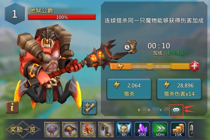 魔物猎杀大地图上还遍布地图怪、黑暗巢穴和资源地,猎杀大型魔物可能需要盟友配合;那如何将座标快速分享给盟友?只要点选红框中的图示,就可以快速将座标进行复制到频道上,不失为一个交换咨询信息的好功能。点击魔物猎杀时,先点击魔物左下角的 i 图标,查看他的防御和伤害类型,就可以根据这个选择相应的英雄出战。关于魔物猎杀,这里提供一组性价比最高的平民英雄出战阵型!魔物防御类型:魔法-----愤怒
