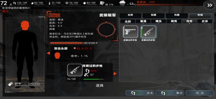 这玩法略微破坏游戏体验,毕竟几天就无敌了只要一个神偷天赋,别的都不重要1.开局两天整点组件把铲子撬棍锯条做了,然后就去药店,药店吃的多,免得饿掉状态耽误发育,顺便整点云南白药,没有也没事,就是容错低了,新手不想重开至少整一个,而且我是有点强迫症,看不得有异常状态,其实吃的够就行2.补满行动力直接去军营等危险程度高的地方连搜个两次再开始拿东西,不用管暴露值,低的话最好,能多几回合容错,有怪出来