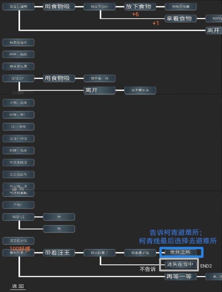 目前还差一个“最是人间留不住”结局,说一下所有结局。按npc分不太严谨,先这样吧,因为可以把每个人要注意的事集中说完。狗子线刷好感注意,给吃的,放地上让狗自己吃。好感开启小避难所地图1、迷失在雪中 在柯青手里拿到量子指南针之前,去狗子地图小避难所。主角、狗子死2、世外之所 在柯青手里拿到量子指南针,再去小避难所。主角、狗子活。柯青线刷好感注意。一定要选我有目的我想进避难所。不然他就不理