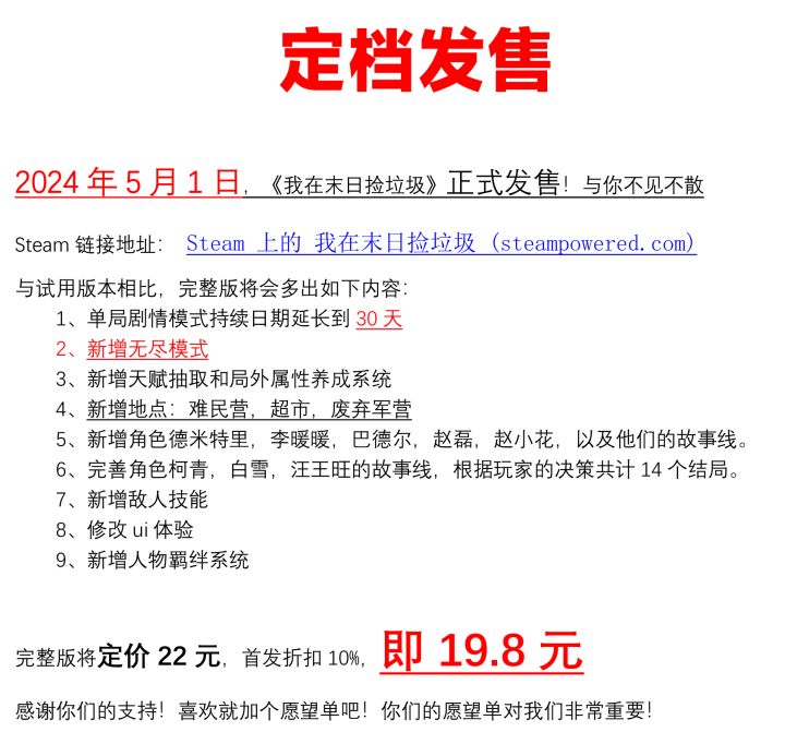 2024年5月1日《我在末日捡垃圾》正式发售!与你不见不散首发价:19.8元!!!!Steam链接地址:https://store.steampowered.com/app/2903460?beta=1与试用版本相比,完整版将会多出如下内容:1、单局剧情模式持续日期延长到30天2、新增无尽模式3、新增天赋抽取和局外属性养成系统4、新增地点:难民营,超市,废弃军营5、新增角色德米特里