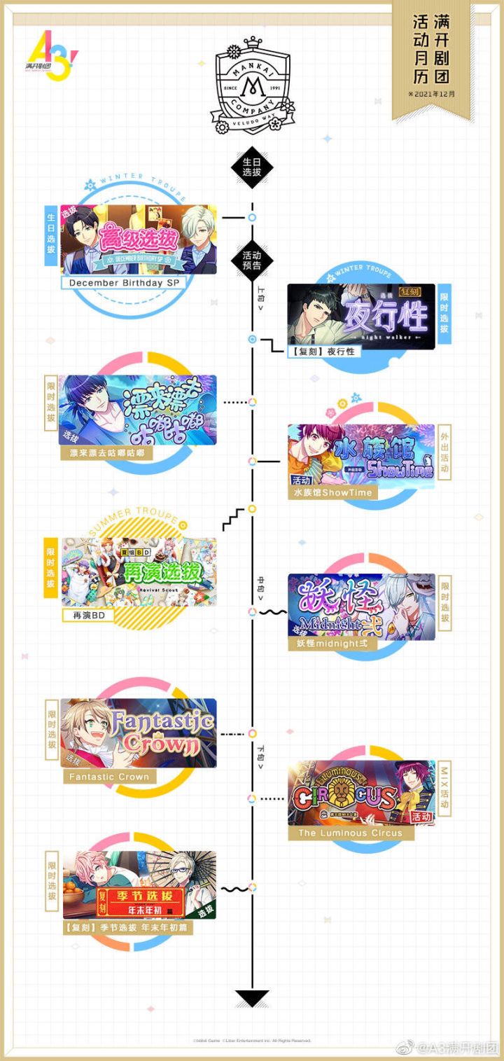 敬爱的总监督:《A3!满开剧团》自2019年11月14日上线至今已有两年有余。回想起这两年多的时光,从刚刚接下负债累累的剧团,到和个性鲜明的剧团成员经历一场又一场公演,共同为满开剧团的未来奋斗;我们也和各位监督一同见证了励志青春的春组,爽朗有趣的夏组,全员不良的秋组和实力派冬组,相信大家也一定与他们留下了独一无二的回忆。遗憾的是,天下没有不散的宴席。因我方与版权方所签署的授权合同即将到期,经过