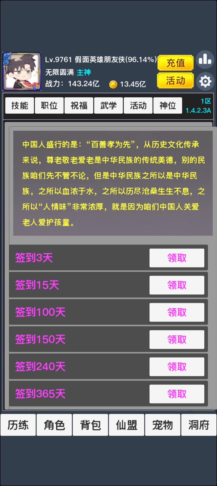 理论上来说这游戏氪不氪金没啥区别,目前还没有啥是氪金专享,氪金只是提前享受,白嫖慢个几年而已,想要他弯道超车那就只有氪金了,所有环节都被精心设置,欧皇会被制裁,非酋有保底,差距要玩很久才比较明显。接下来是攻略,实际上没啥攻略每天签到一次自动完成大部分任务,剩下就是仙盟捐献和拼夕夕砍价还有环境挑战,战力提升就上线的时候能打开的界面就都打开点几下点到点不动为止,简单无脑,最新版本离线经验更新,勤快一点