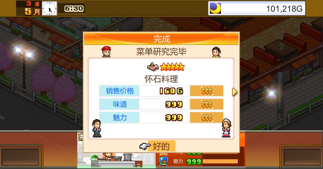 之前的极限都是2年11月(看广告的不算),这次终于2年8月怀石了,难度非常的高,所以就不出详细攻略了。路线就是炒饭到火锅的路线,2店开在2地区,3店开在3地区,最后把2店迁到5地区,最有挑战性的节点是2年4月一次探索拿下烤鱼。