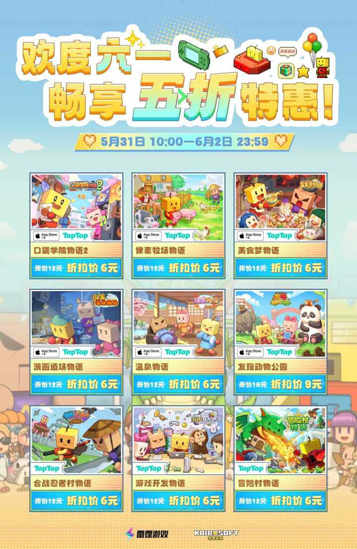 大家好,这里是开罗运营小队o(* ̄▽ ̄*)ブ!六一儿童节就要来咯~不知道大家有多少属于童年的回忆是和开罗一起度过的呢,还记得小时候玩的第一款开罗游戏吗?在这个美好天真的节日里,小队在这祝各位大朋友们儿童节快乐!欢度六一怎么能少了好玩的开罗游戏呢~小队今天为大家准备了儿童节特价福利,欢度六一,畅享五折特惠!TapTap和AppStore均能享游戏折扣福利!活动时间为: 5月31日10:0